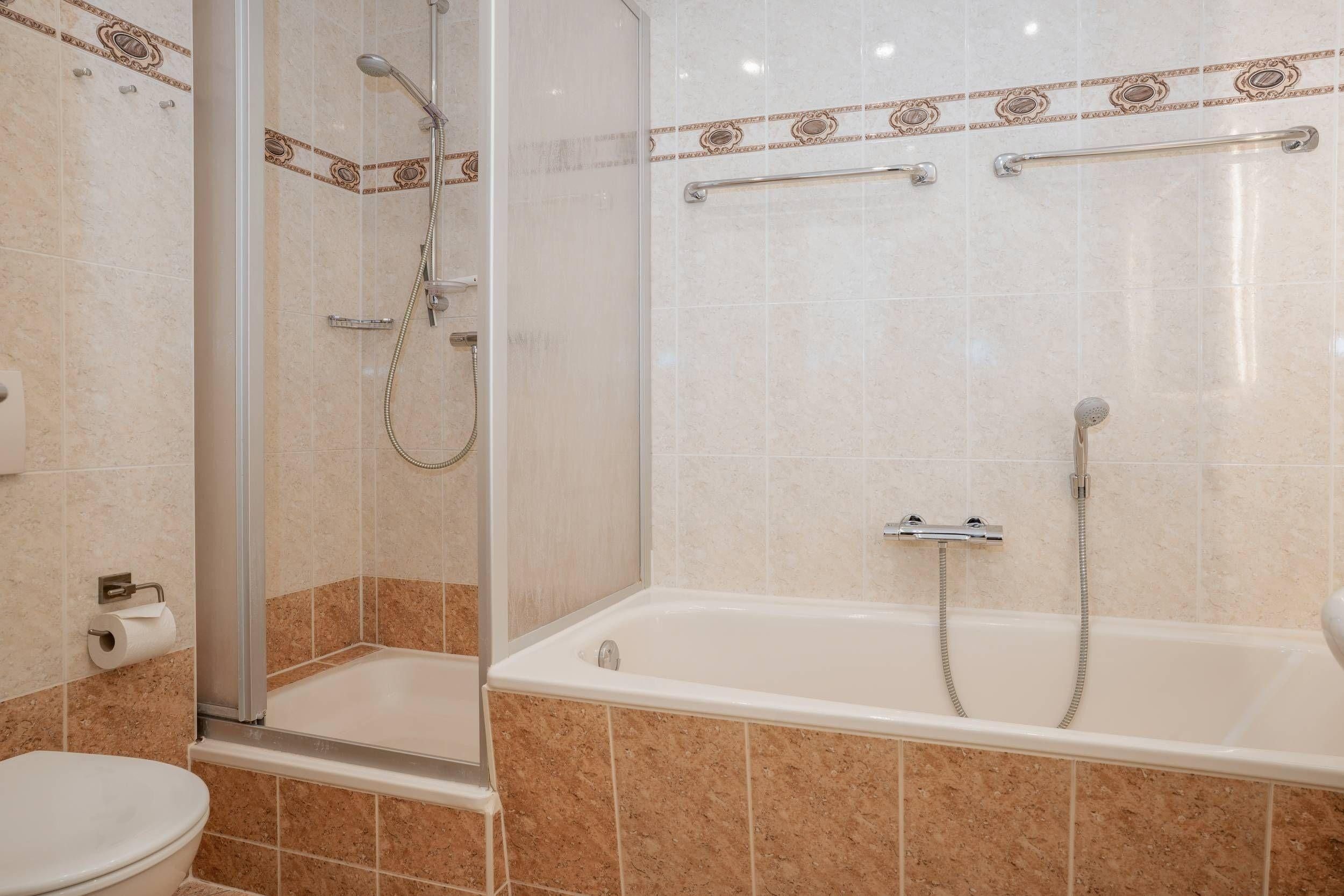 Neben dem Badezimmer mit Dusche, Badewanne, Waschmaschine und Trockner gibt es auch ein Gästebad.