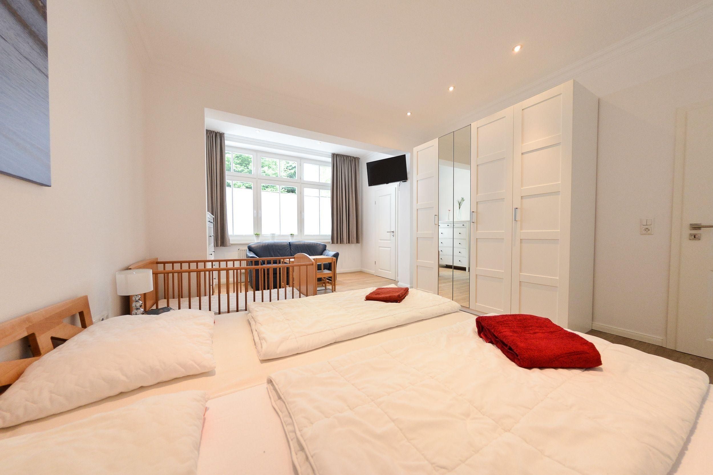 In dem ersten Schlafzimmer befindet sich ein Doppelbett, ein großer Kleiderschrank, ein Babybett, eine Schlafcouch für 2 Personen und ein zusätzliches Fernsehgerät. Das zweite Schlafzimmer besteht aus einem Doppelbett sowie einem Kleiderschrank.