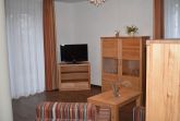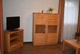 Das Wohnzimmer mit abgeteilter Küchenzeile und Esstisch ist sehr großzügig geschnitten. Es beinhaltet eine gemütliche Polstergarnitur und einen großen TV. Die großen Terrassenfenster bieten einen schönen Blick ins Grüne. Die 12qm große Terrasse die zur Wohnung gehört, ist mit modernen Terrassenmöbel und einem Strandkorb ausgestattet. Das Schlafzimmer ist mit einem großen Doppelbett und einem zweiten TV ausgerüstet. Das Bad ist modern und zweckmäßig hergerichtet.