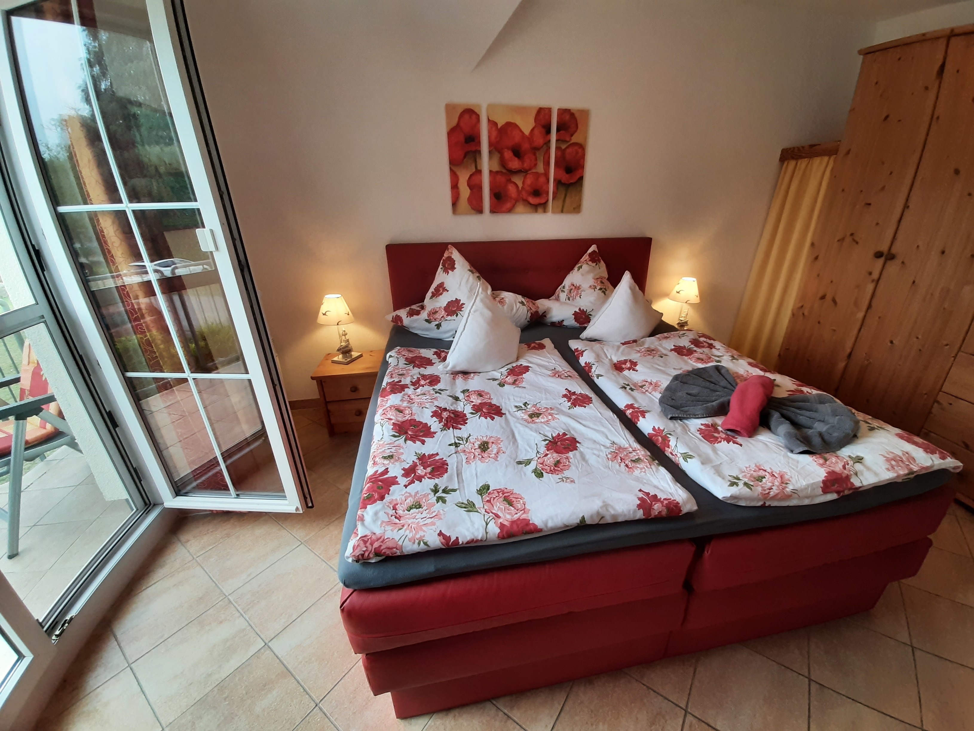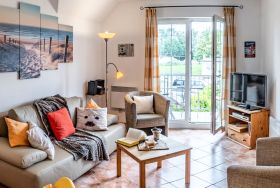 Die 2-Zimmerwohnung (44m²) für 2- 4 Personen verfügt über einen großen Balkon, der von beiden Zimmern aus erreichbar ist. Die Türfenster (mit Mückenschutz) in beiden Räumen haben Rollläden. Alle Räume sind mit Bodenfliesen ausgestattet, was besonders hundefreundlich ist.
