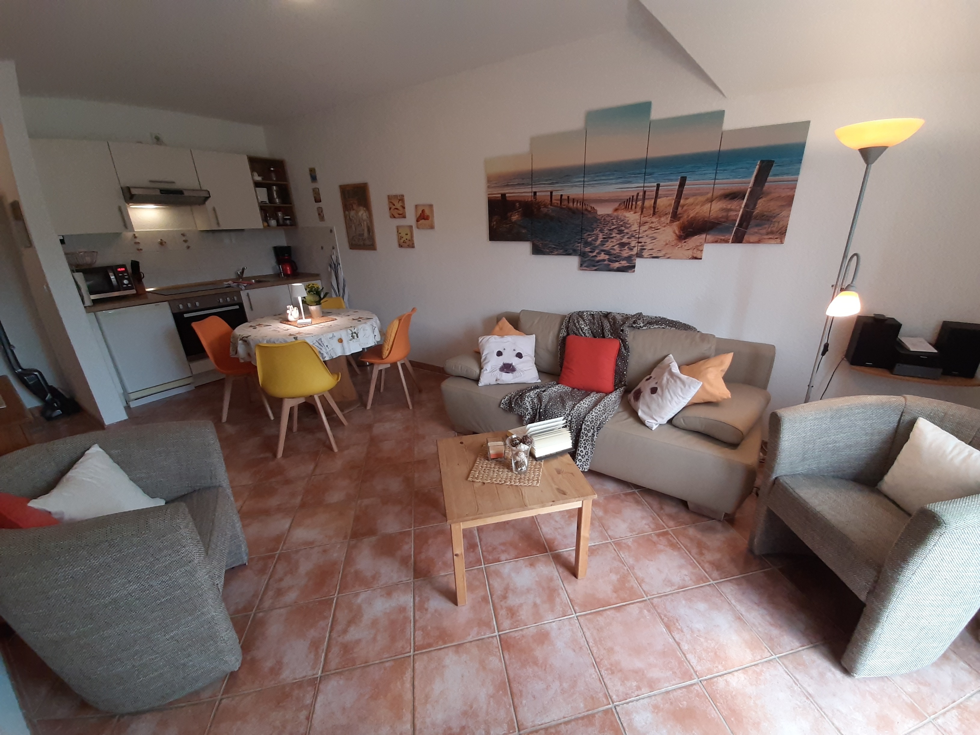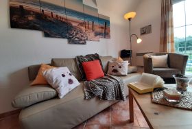 Im Wohnzimmer steht eine gemütliche, zum Doppelbett (140×190) ausziehbare Coach mit vielen Kissen, ein Fernseher und 2 Sessel. Im Regal unter dem Fernseher befindet sich eine Holz-Spielesammlung mit vielen Gesellschaftsspielen.