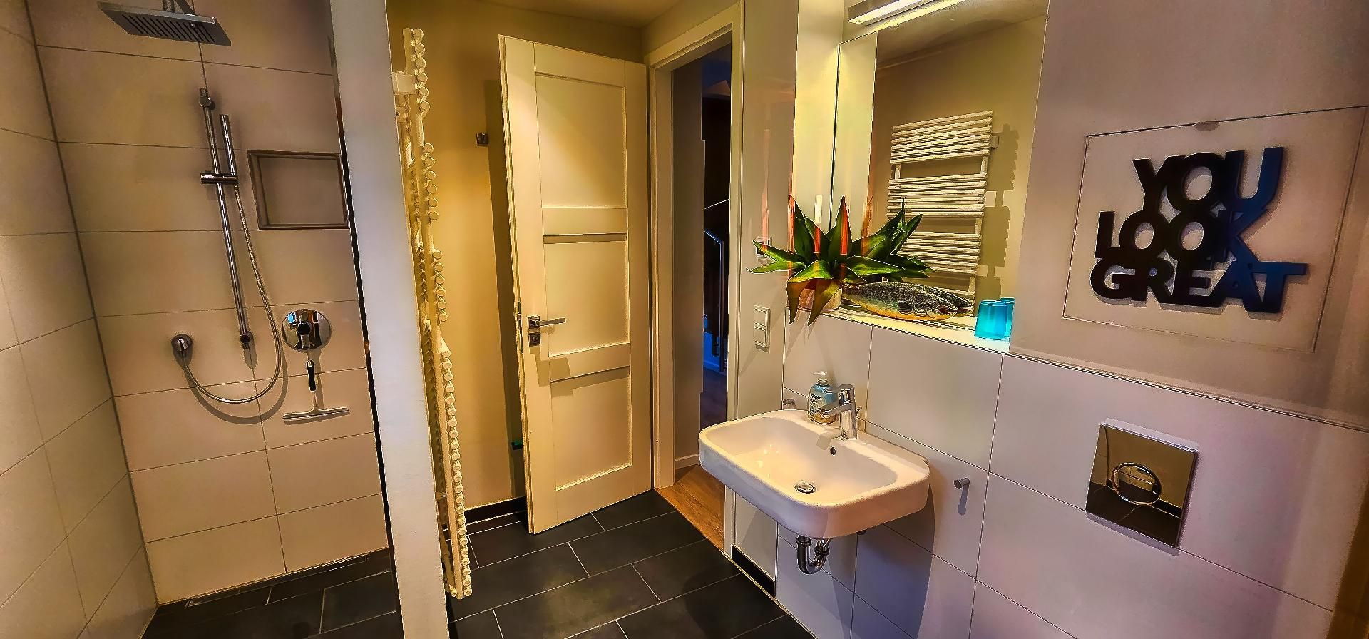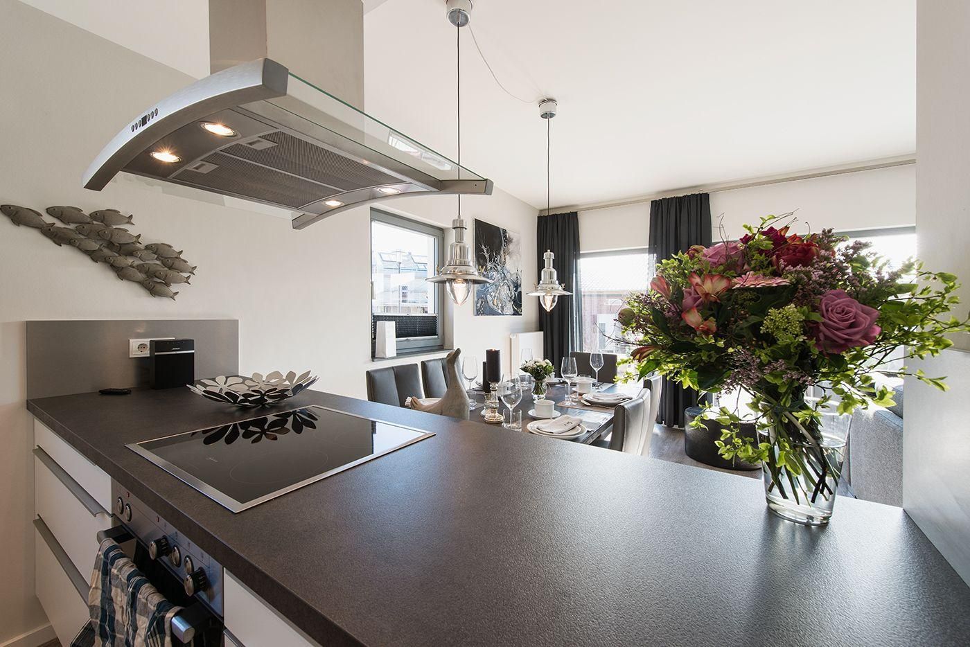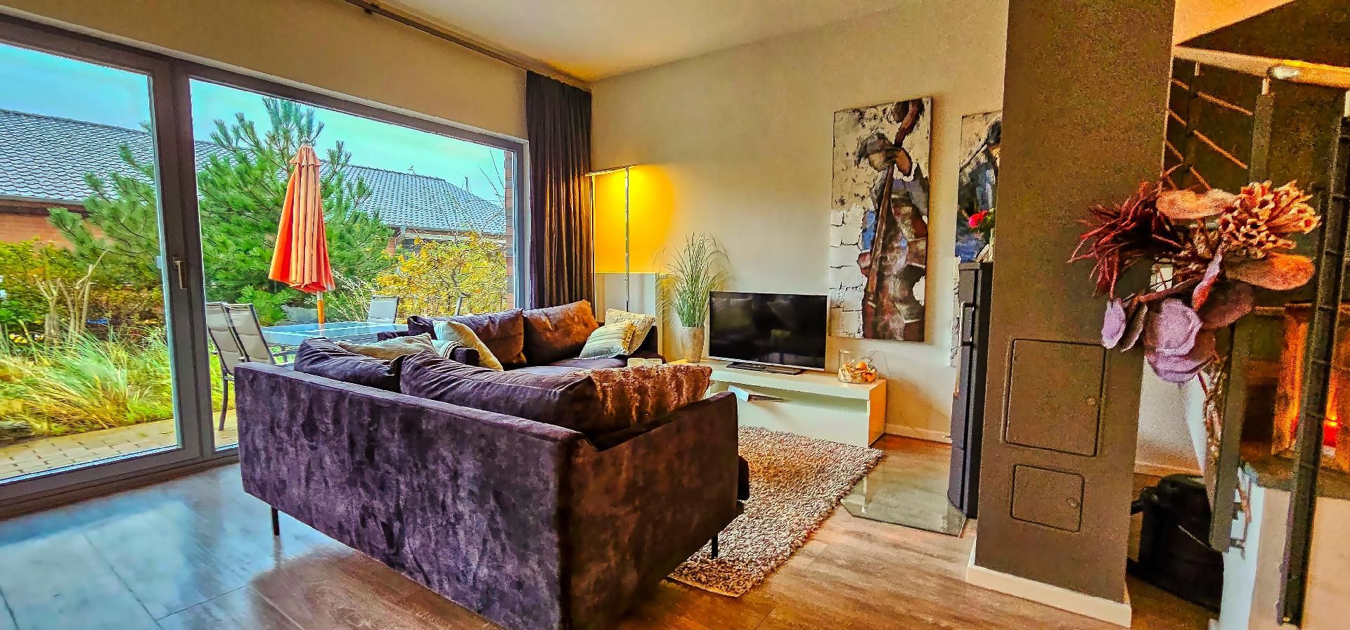 Im Erdgeschoss befindet sich eine hochwertige, zum Essplatz mit seinem großen Tisch hin, offene Küche. Der Wohnbereich mit Kamin lädt in der kühleren Jahreszeit mit seinem flackernden Feuer auf die schönste Art zum Entspannen ein. Auch das im EG gelegene Duschbad inklusive Sauna – empfiehlt sich für einem wohltuenden und entspannenden Aufenthalt nach langen Strandspaziergängen. Vom Wohnzimmer gelangen Sie auf eine zum Yachthafen hin ausgerichtete voll ausgestattete Terrasse und einem nur von Ihnen zu betretenden kleinen Garten als Dünenlandschaft mit Sonnenliegen, Sonnenschirm und dem Strandkorb, der Ihr Urlaubsfeeling geradezu perfekt macht.