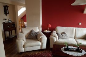 Die schöne und gemütliche Nichtraucher- Ferienwohnung befindet sich in der ersten Etage eines Zweifamilienhauses und ist über einen separaten Eingang / Treppe erreichbar. Es erwartet Sie ein helles Wohn- und Esszimmer mit TV, DVD und Radio-CD-Player, ein Schlafzimmer mit Doppelbett, ein Balkonzimmer mit zwei weiteren Schlafplätzen, ein Frühstücks-Balkon mit Gartenmöbeln, Schirm und Auflagen, ein komfortables Duschbadezimmer, eine schicke Küche mit Herd, Backofen, Mikrowelle und Geschirrspüler, sowie ein zusätzliches WC mit einer Wasch-Trocknerkombination. Insektenschutz befindet sich an Fenstern und Balkontür. Bettwäsche, Handtücher und Geschirrtücher sind vorhanden. Auf Anfrage sind Haustiere erlaubt.