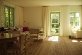 Die Wohlfühlferienwohnung auf einer Ebene mit separatem Eingang ist im modernen Countrystyle gestaltet. Ein großes helles Wohnzimmer mit hochwertiger Schlafcouch ist voranden. Ausserdem ein Schlafzimmer mit Französischem Bett 140cm und einem Zustellbett von 80cm Breite. Es gibt eine sehr gut ausgestattete Küche mit Geschirrspüler. Weiterhin steht ein Badezimmer mit Badewanne zur Verfügung. Die Wohnung bietet ein bis vier Personen viel Platz mit Ambiente. Die 76 m² sind liebevoll eingerichtet und bieten viel Komfort. Es gibt Sat-TV und Internet per Wlan.