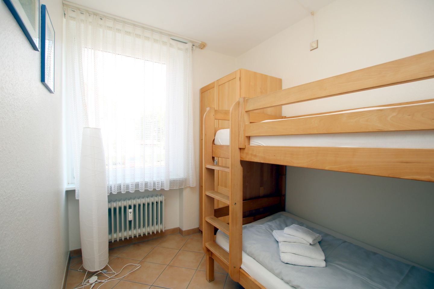 SCHLAFZIMMER 2 mit Etagenbett und kleinem Kleiderschrank. BAD mit Dusche und WC. Kleiner Abstellraum. Im KELLER stehen Münzwaschmaschine, -trockner und Fahrradabstellraum zur Verfügung. Zum Strand sind es nur wenige Schritte. Einkaufsmöglichkeiten befinden sich in der Nähe. Zum Zentrum, Familienbad und Kurmittelhaus sind es ca. 15 - 20 Minuten Fußweg. Die Wohnung ist hell und freundlich eingerichtet und komplett mit Fliesen ausgelegt. Balkon mit 4 Stühlen. Eine gemütliche und komfortable Wohnung direkt am Strand.