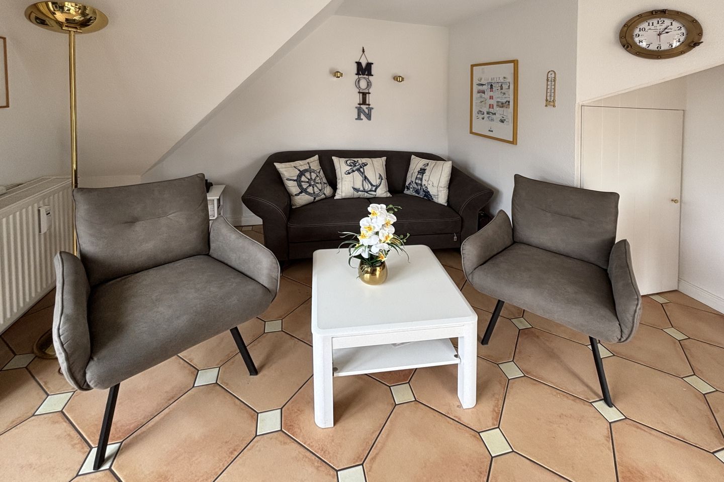 Wohnzimmer mit Ledercouch und 2 Sesseln, Essplatz mit 4 Stühlen, Küchenzeile mit Backofen, Mikrowelle und Spülmaschine. Bad mit Dusche und WC. Das Kinderschlafzimmer in der ersten Etage mit 2 Einzelbetten, Kleiderschrank und 2. TV. Vom Flur führt eine offene Treppe ins Galerieschlafzimmer mit Doppelbett und eingebautem Kleiderschrank und Babybett in der Abseite. Auf dem Balkonen ist einmal 1 Tisch und 2 Stühle und einmal ein Strandkorb. Die Schlafzimmer sind mit Laminatboden, die übrigen Räume sind mit Terracottafliesen ausgelegt. Internetanschluss über WLAN vorhanden. Die Wohnung ist modern und komfortabel eingerichtet und in einer Nebenstraße sehr ruhig gelegen. Zum Zentrum sind es nur wenige Gehminuten entfernt. Kurmittelhaus und Erlebnisbad sind nach ca. 700 m erreichbar. Der Hauptstrand ist nur ca. 300 m entfernt. Im Keller des Hauses stehen Münzwaschmaschine und Wäschetrockner zur Verfügung.