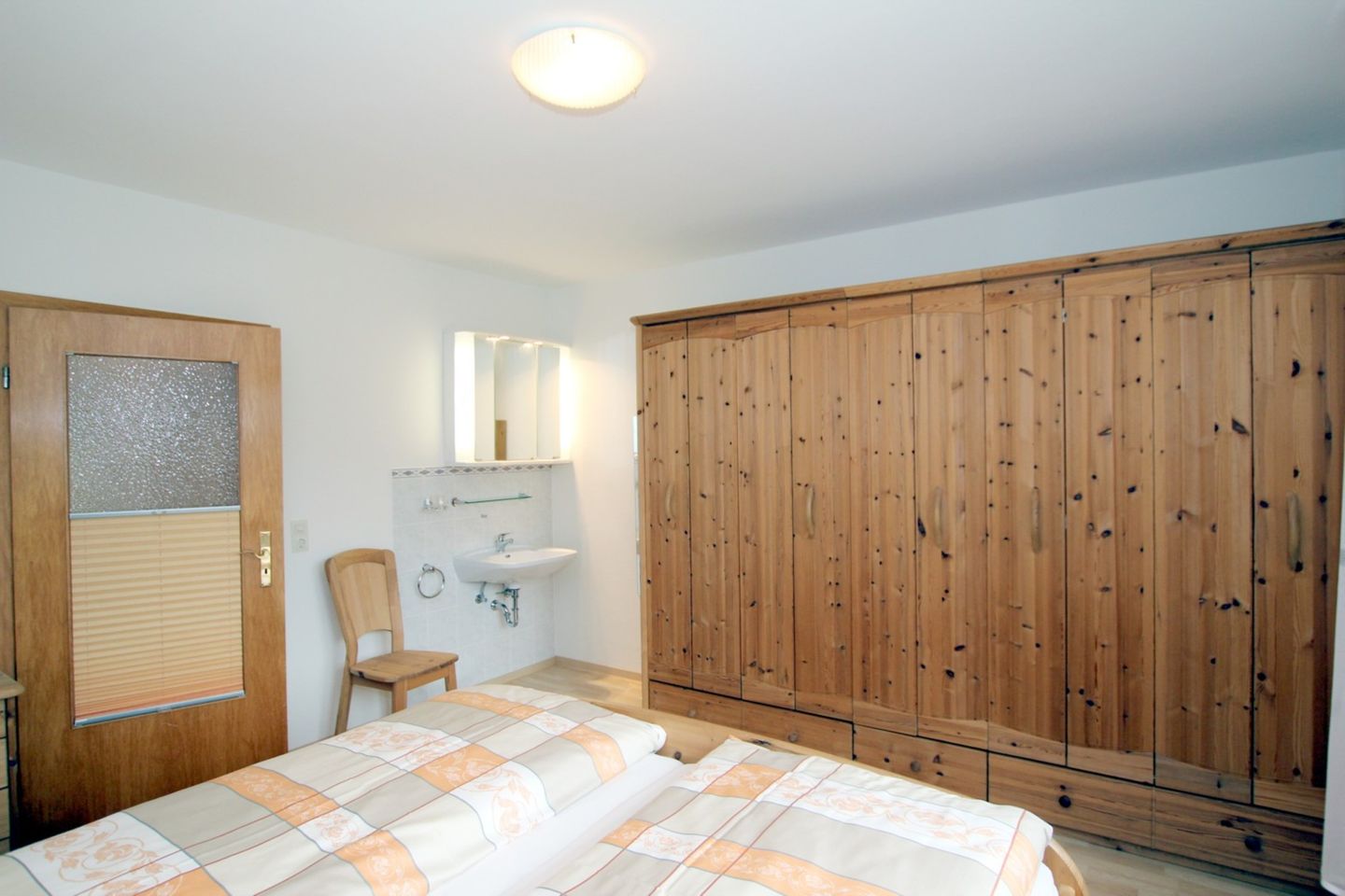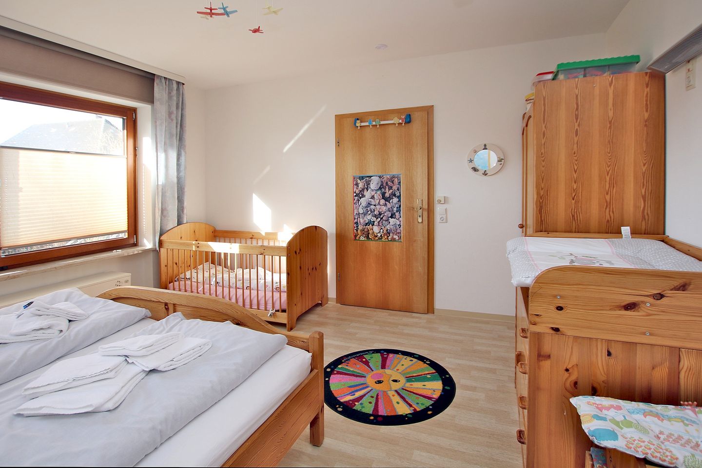 SCHLAFZIMMER 1: mit Doppelbett (1,80 x 2 m), Kleiderschrank und extra Waschbecken. SCHLAFZIMMER 2: mit Doppelbett (1,80 x 2 m), Holzkinderbett und Wickelkommode.