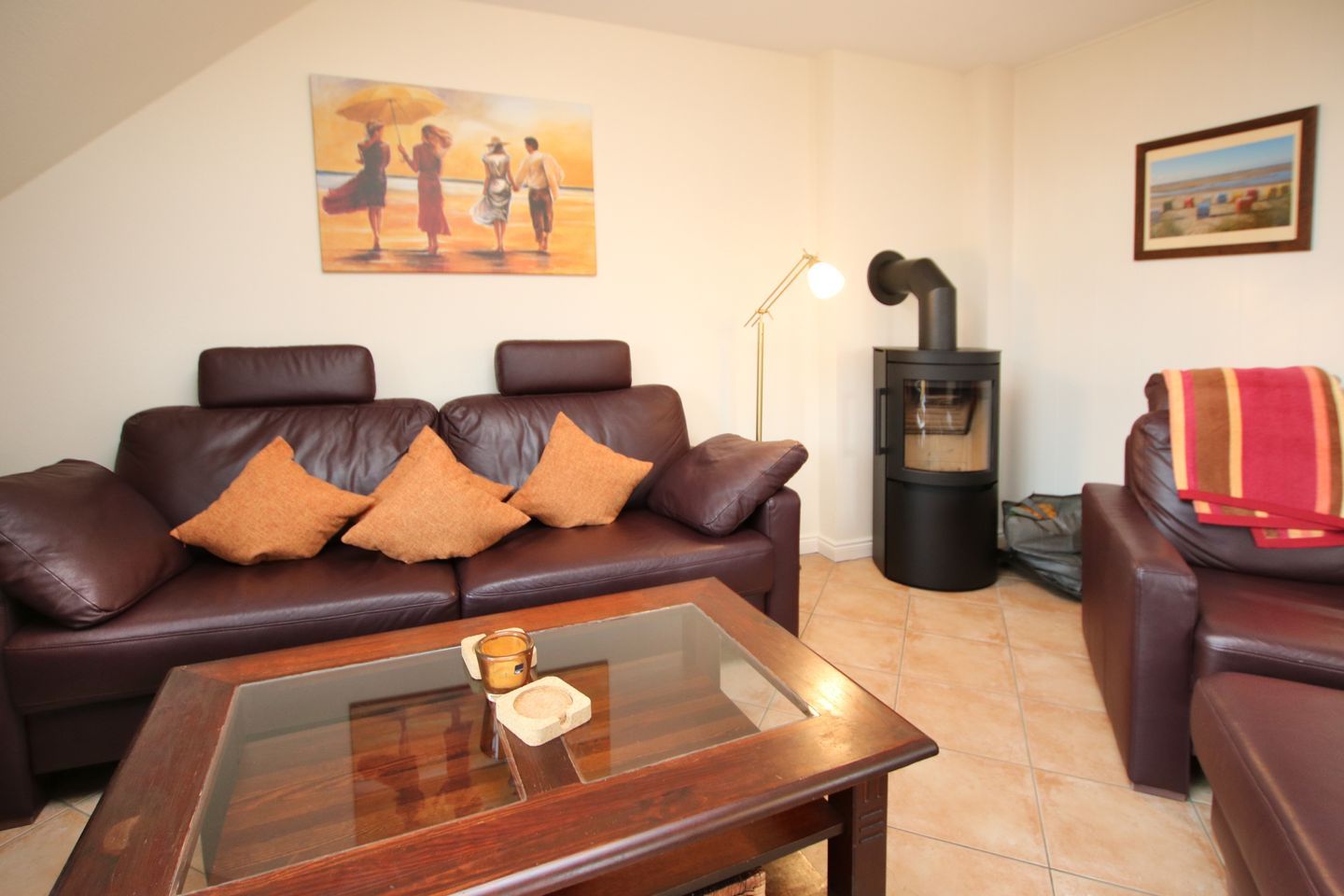 Im lichtdurchflutenden WOHNZIMMER relaxen Sie auf einer großzügigen Ledergarnitur mit Sesseln, die sie zu gemütlichen Fernsehabenden einlädt. Der Essplatz verfügt über einen Tisch mit 5 Stühlen und für behagliche Stunden in der kalten Jahreszeit steht ein Kaminofen für Sie bereit.