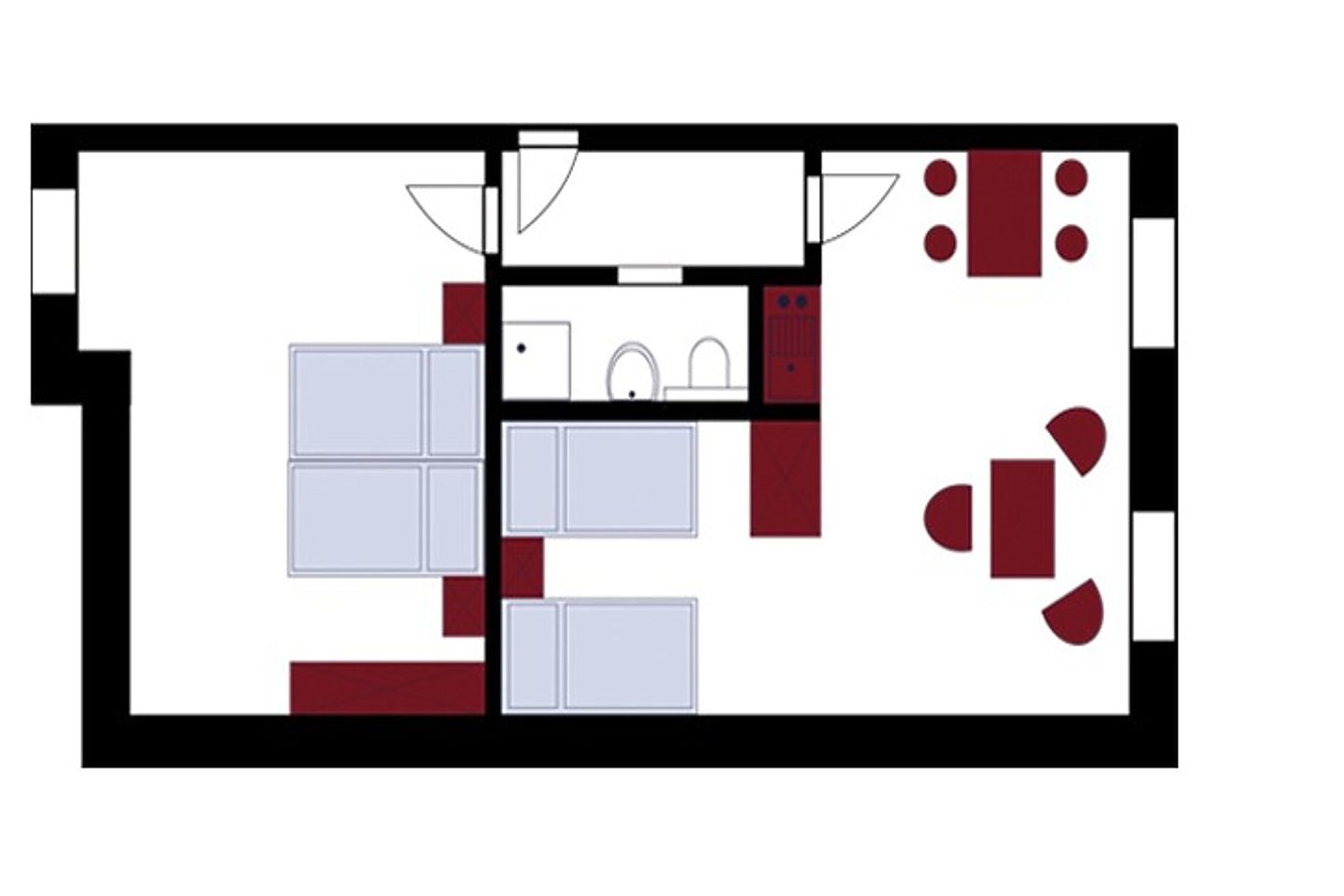 Wohn-Schlafraum mit 2 Einzelbetten, gemütlicher Sitzecke, Essplatz, Flachbild-TV, Radio, Essplatz für bis zu vier Personen. 1 separates Schlafzimmer mit Doppelbett, Pantryküche, 1 Duschbad / WC, kostenfreies W-LAN.