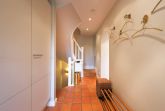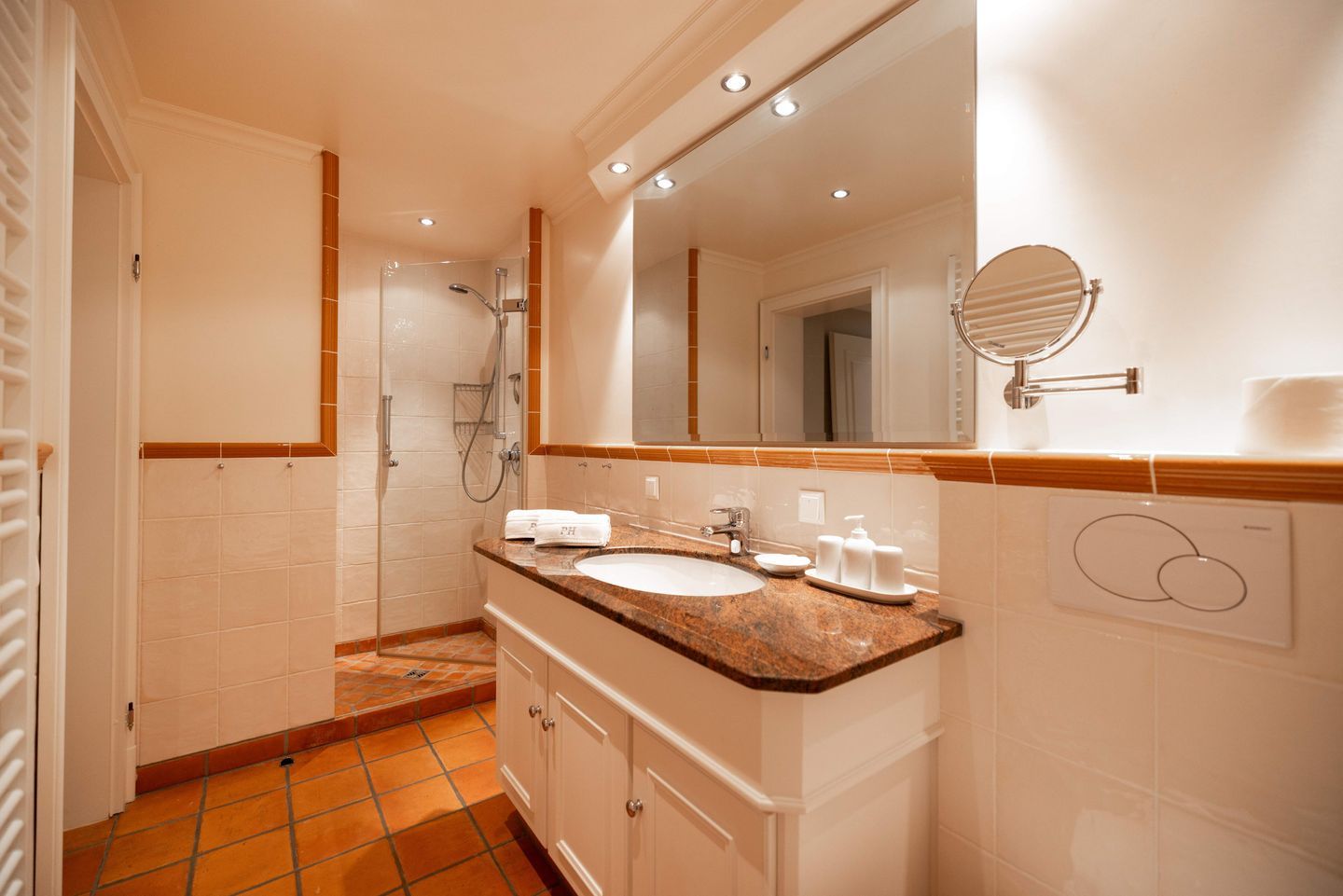 Die Badezimmer befinden sich auf denselben Ebenen wie die Schlafzimmer und sind mit Handtüchern und Bademänteln bestückt. Das untere Bad verfügt über eine bodengleiche Dusche und ein großes Waschbecken mit Ablagefläche. Ein Handtuchwärmer gehört ebenso zur umfassenden Ausstattung wie ein ansprechendes, modernes und helles Fliesendesign. Dieses findet sich auch im oberen Badezimmer wieder, welches mit Badewanne und Doppelwaschtisch keine Wünsche offen lässt. Ein Kosmetikspiegel und ein Fenster runden die Ausstattung hier ab.