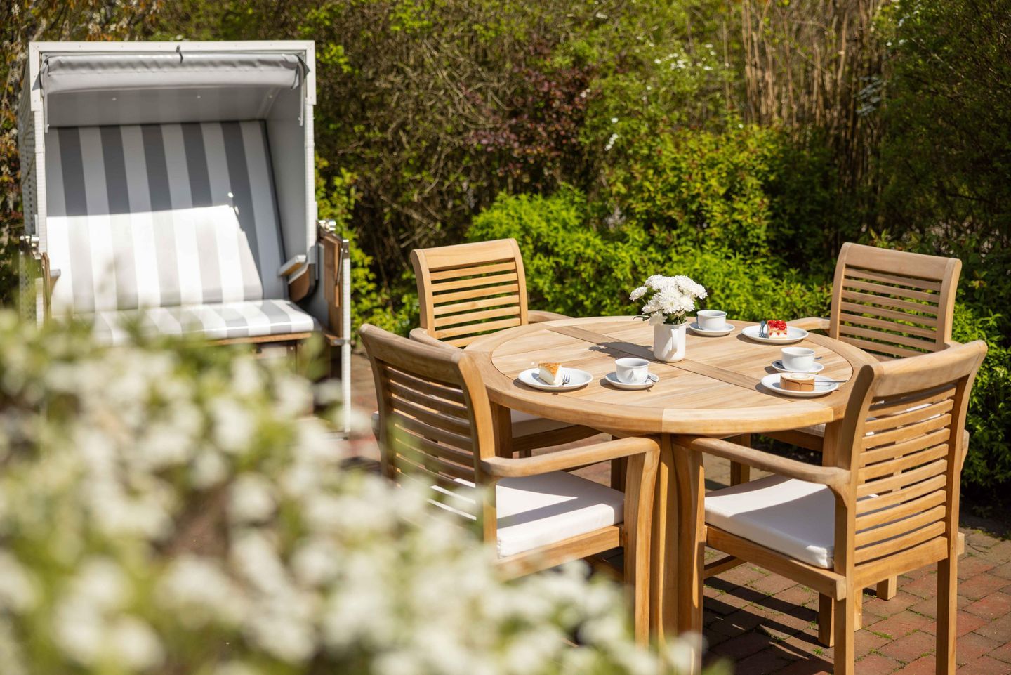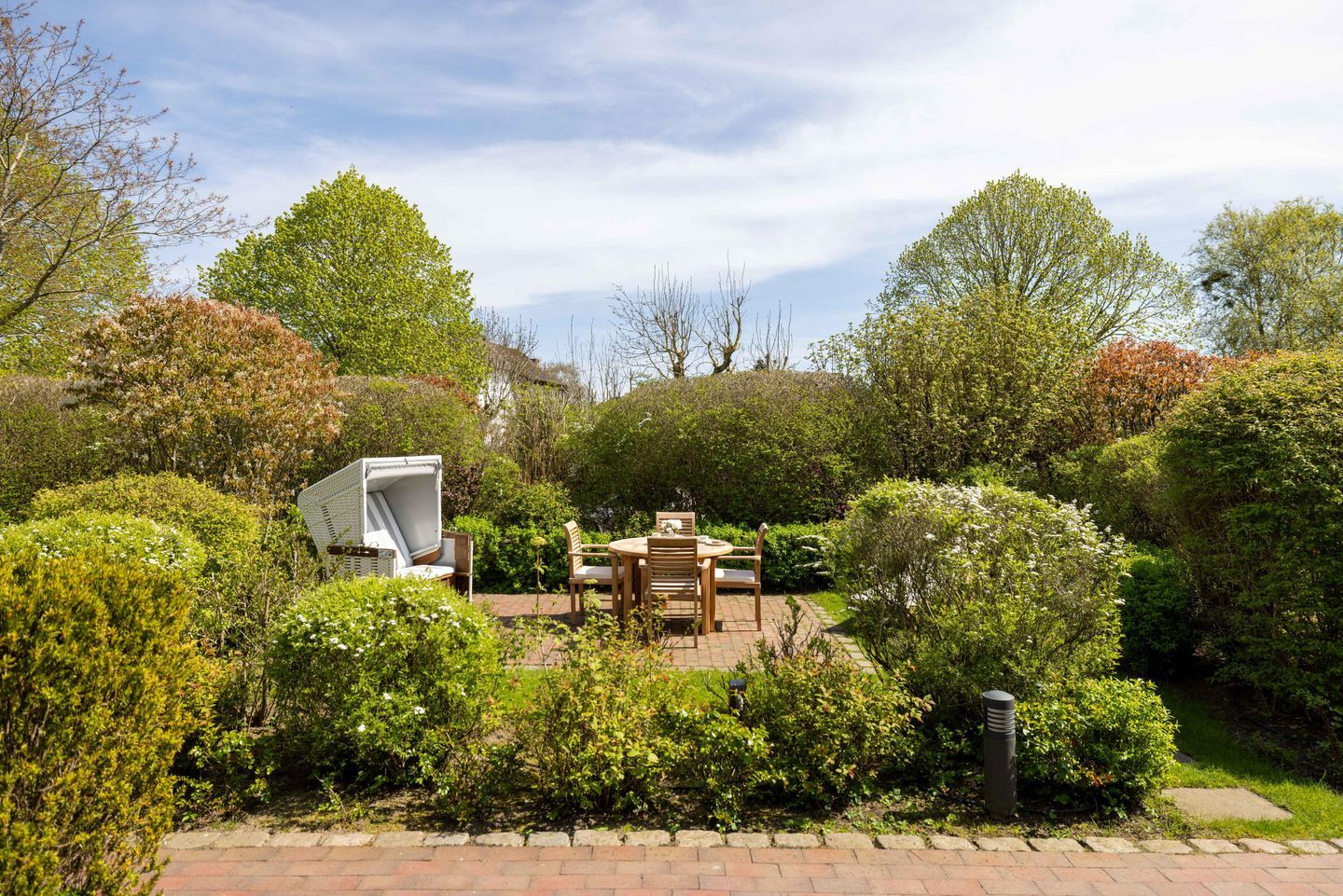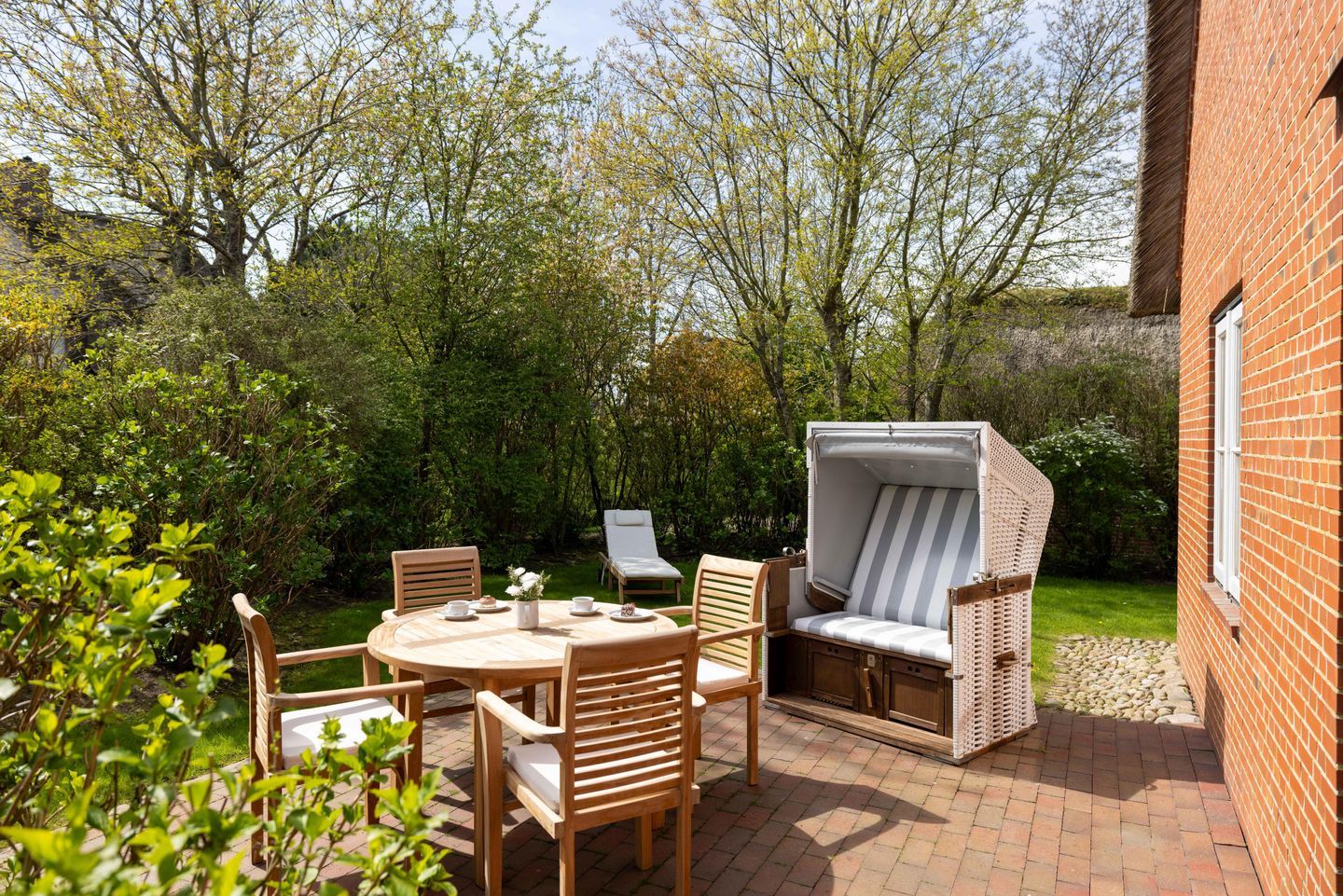 Das Ferienhaus gehört zu einem Komplex mit zwei weiteren Hausteilen, alle unter Reet. Im eigenen sonnigen, geschützten Gartenanteil stehen neben einem Strandkorb auch ein Tisch mit Stühlen und Sonnenschirm zur Verfügung. Zwei Liegen laden zusätzlich zu entspannten Stunden im Garten ein.