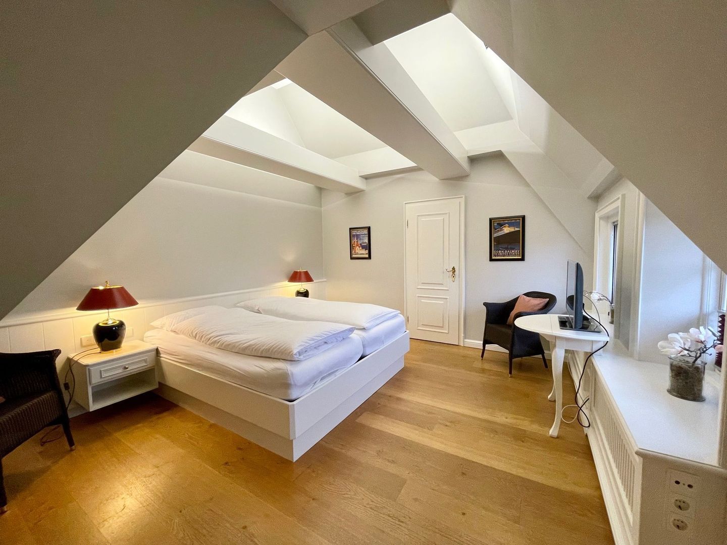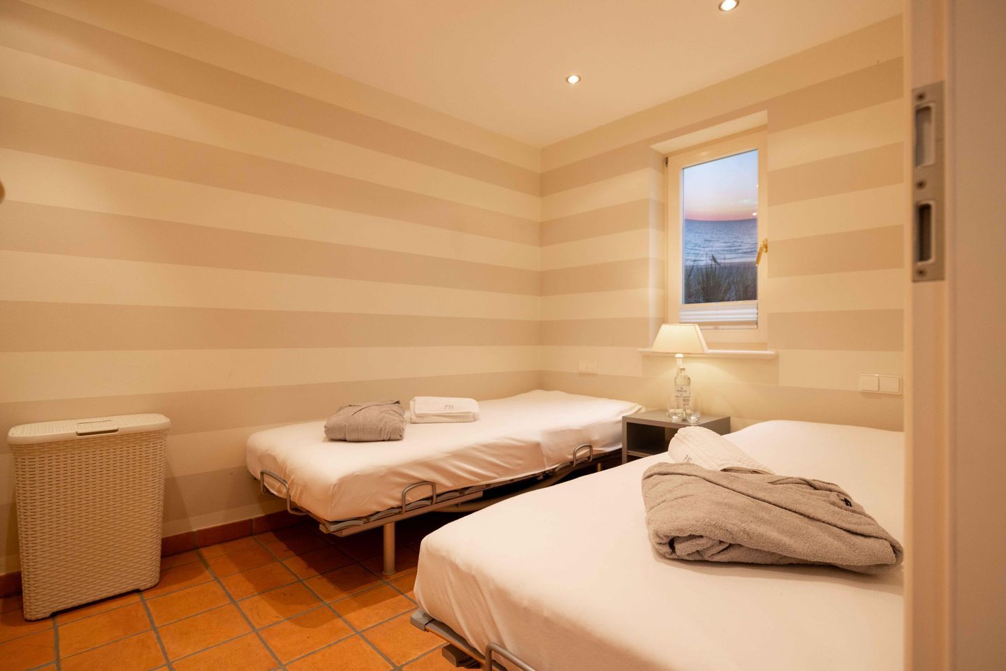 Die Unterkunft ist über den Wohnbereich hinaus mit zwei Schlafzimmern und zwei Badezimmern ausgestattet. In beiden Schlafzimmern gibt es ebenfalls einen Fernseher. Das größere Schlafzimmer (20qm) verfügt zudem über ein großzügiges Doppelbett (200x200cm) in komfortabler Höhe. Ein Safe ermöglicht das sichere Verwahren von Wertgegenständen. Zusätzliche Sitzmöglichkeiten und umfangreicher Stauraum für das eigene Gepäck runden den Raum ab. Das untere Schlafzimmer bietet ebenso viel Komfort.