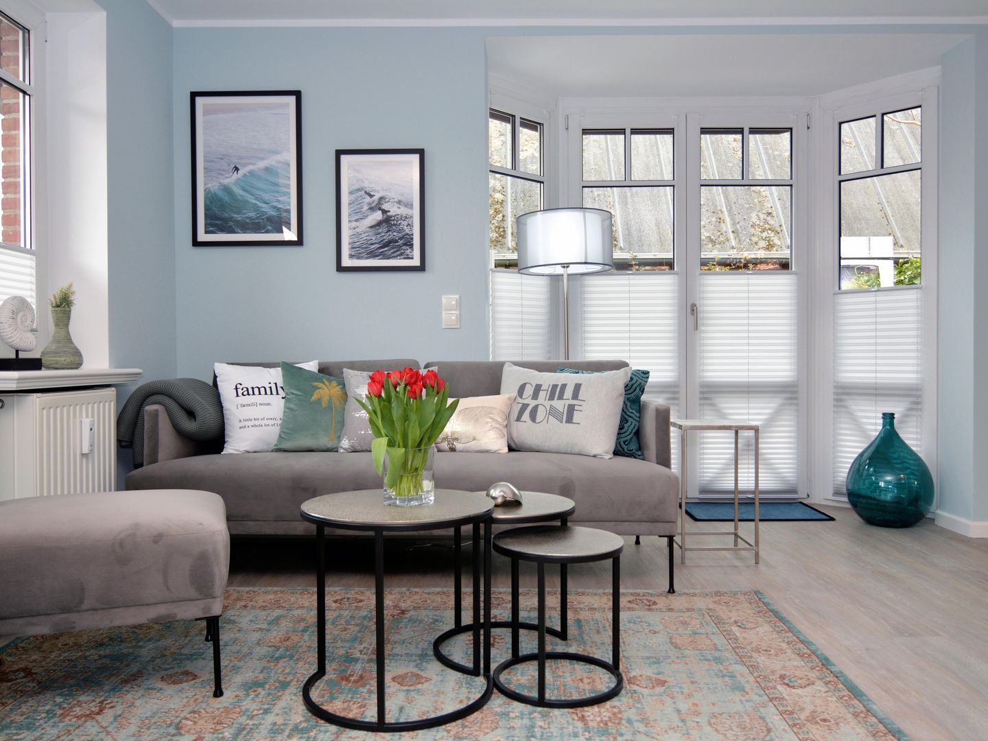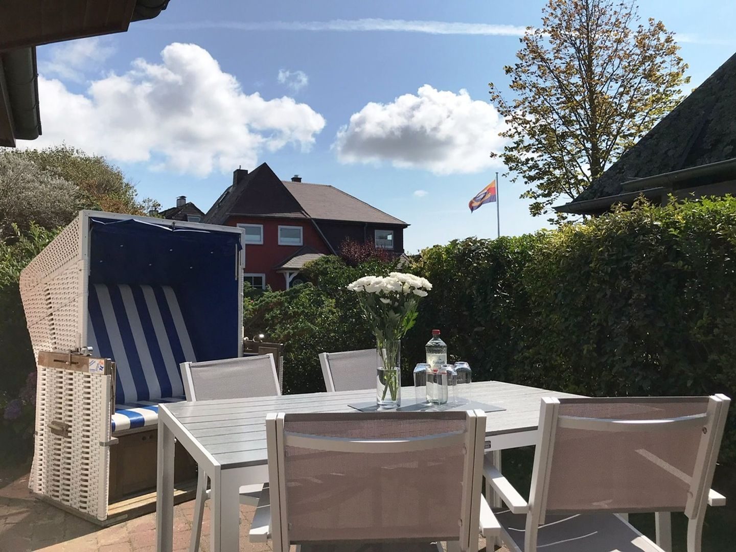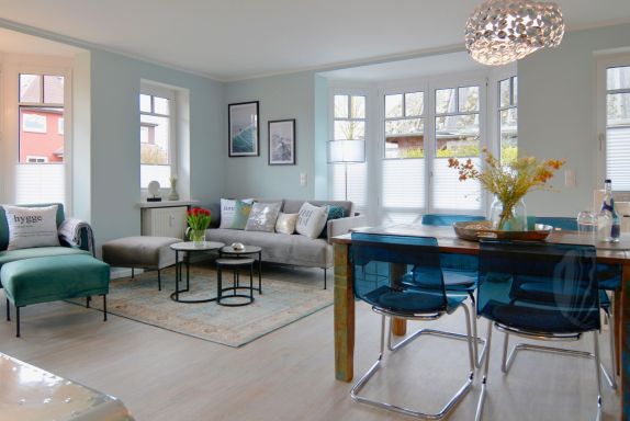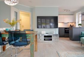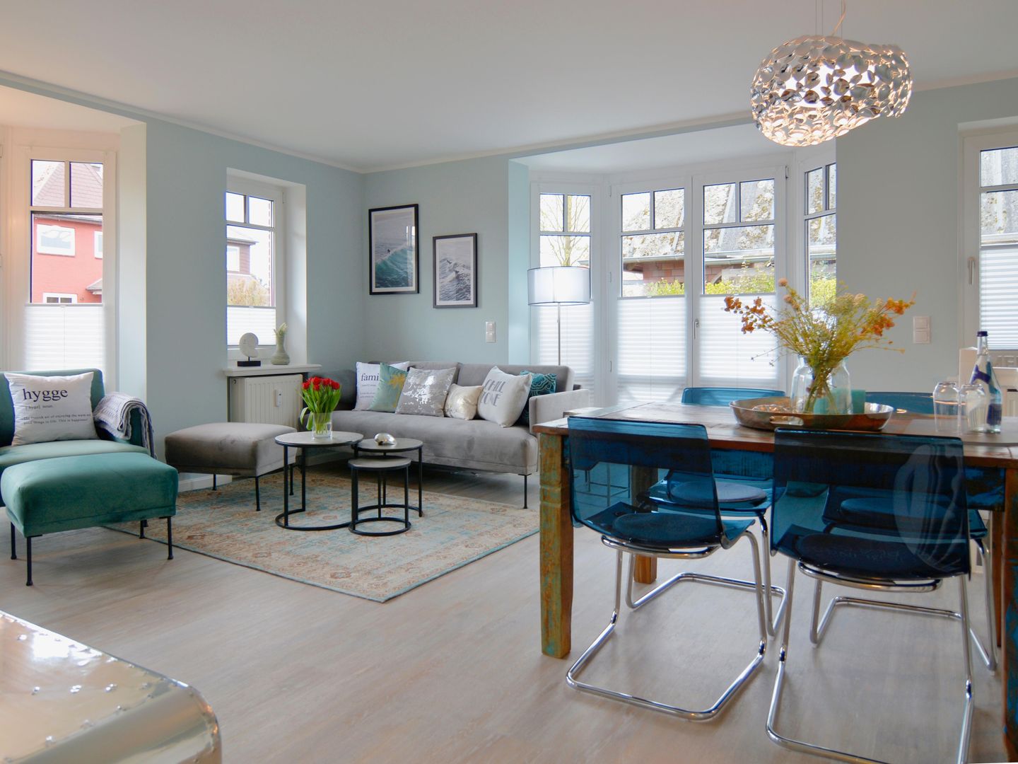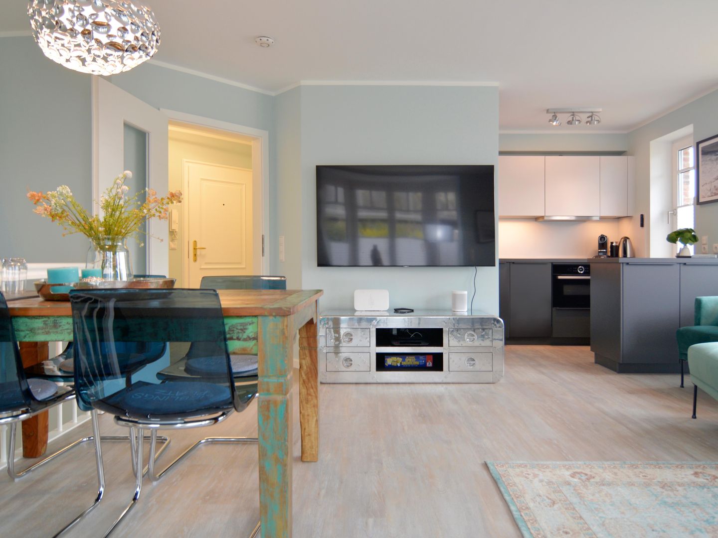 Herzstück dieser tollen Wohnung ist das geräumige Wohnzimmer mit offener Küche, gemütlicher Couch, 2 Sesseln und Esstisch mit 4 Stühlen. Von hier aus haben Sie auch direkten Zugang zu Ihrer eigenen Terrasse mit Strandkorb und Gartenmöbeln in Südausrichtung.