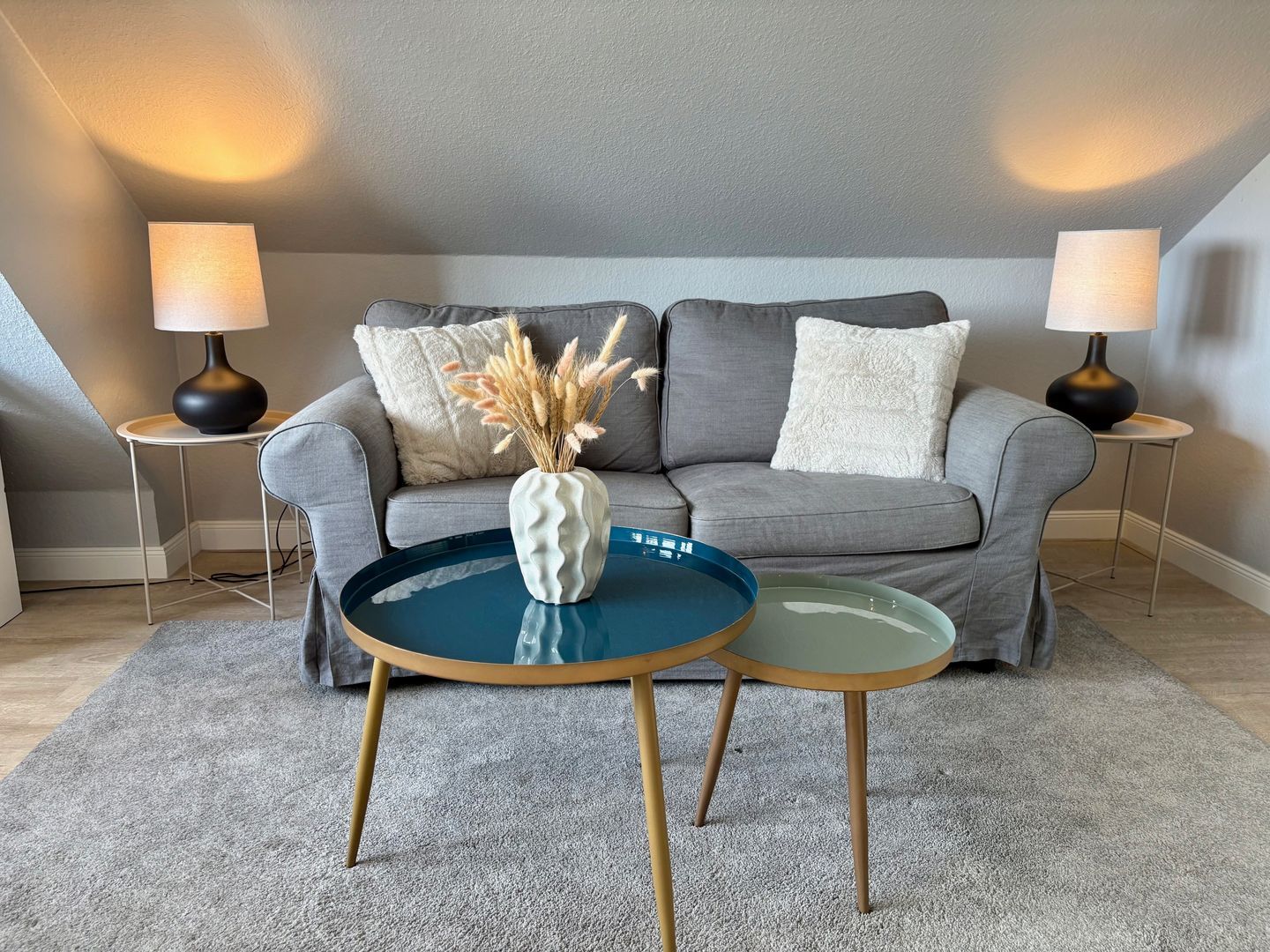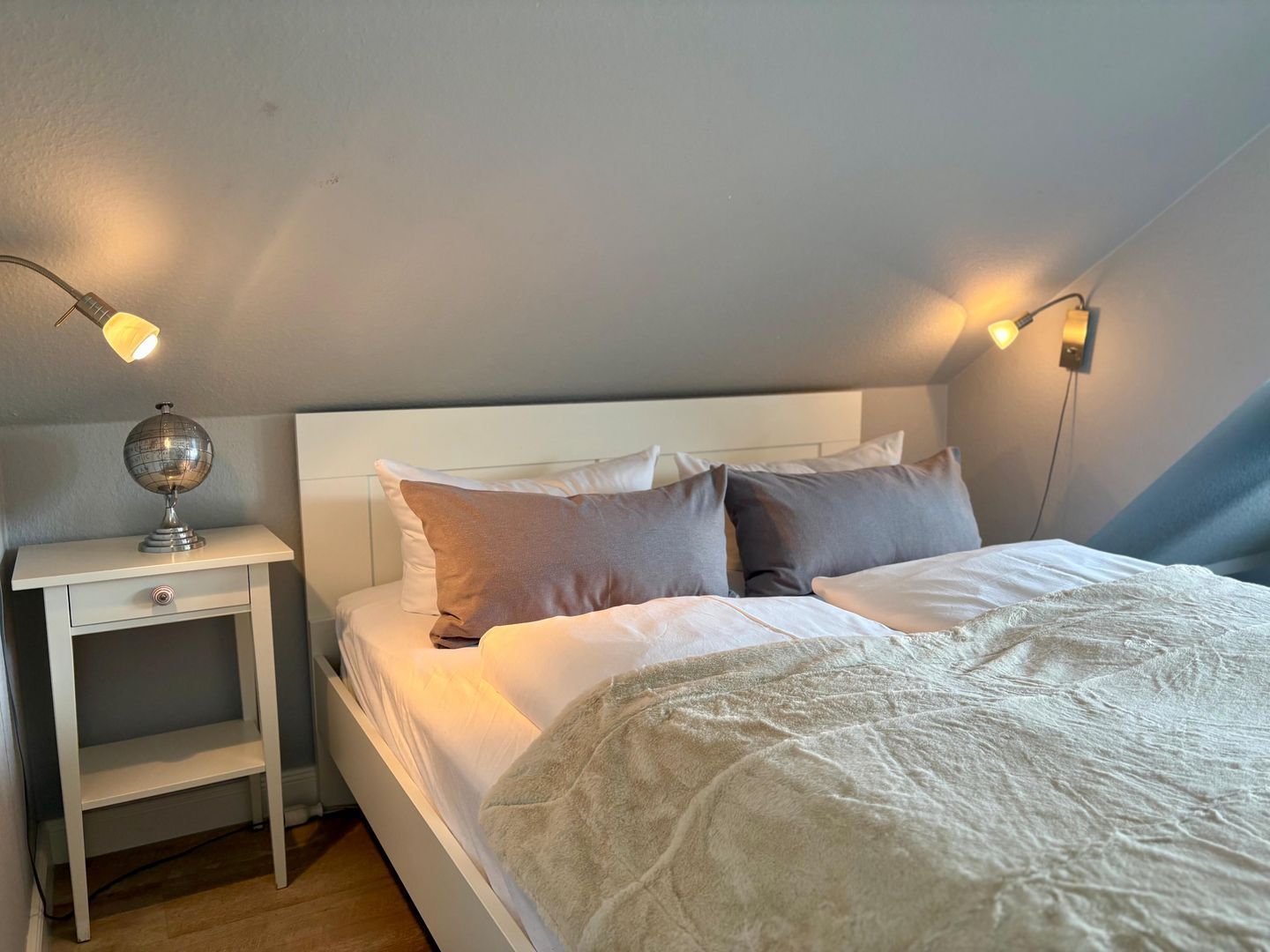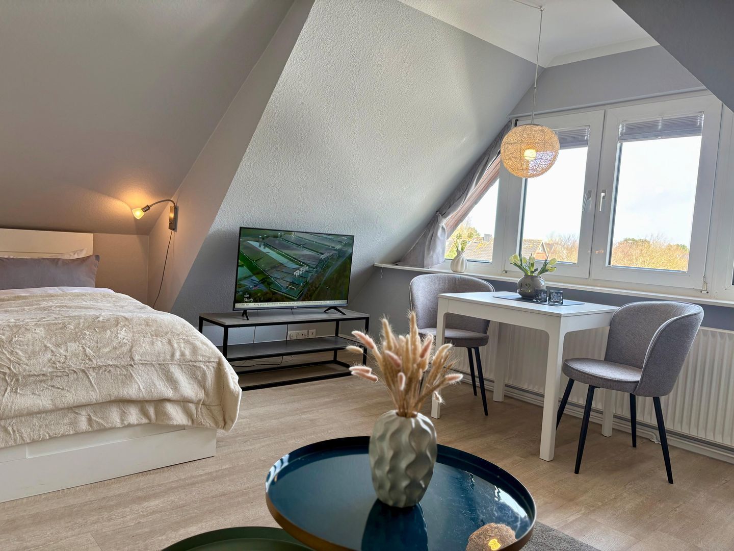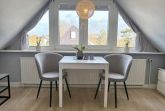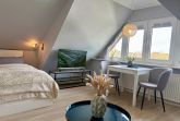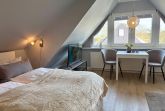 Unser helles 1-Zimmer-Appartement ist ca. 35m² groß und besteht aus einem geräumigen Wohnzimmer mit einer Essecke, einer Sitzecke, einem feststehendem Bett (160x200), einer separaten Küche, Flur und einem Duschbad.