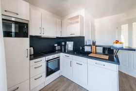 Küchenzeile: Geschirrspüler, Cerankochfeld, Mikrowelle, Backofen, Kühlschrank mit Gefrierfach.