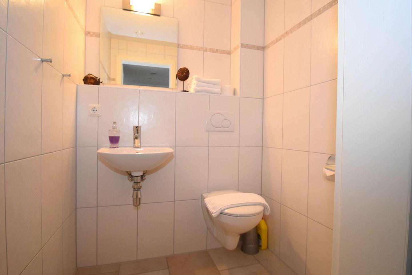 Sanitär: Duschbad mit ebenerdiger Dusche, WC, Haar-Föhn, Kosmetikspiegel, Gäste-WC