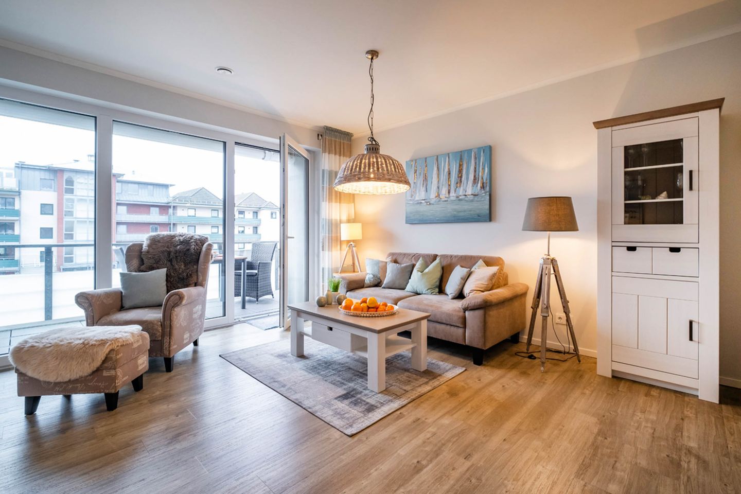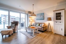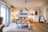 Das Appartement 2.4 befindet sich im II. Obergeschoss mit Balkon und wurde sehr gemütlich von den Eigentümern eingerichtet. Das warme, behagliche Wohlfühl-Wohnzimmer wird abgerundet durch ein gemütliches Sofa und einen Ohrensessel mit Fußhocker.
