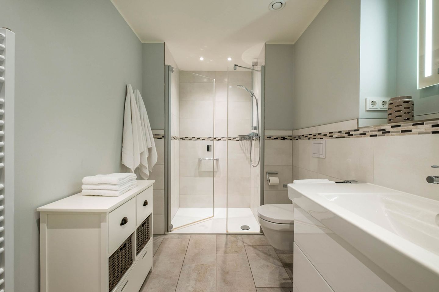 Das Bad ist großzügig mit Handtuchheizung und Dusche.