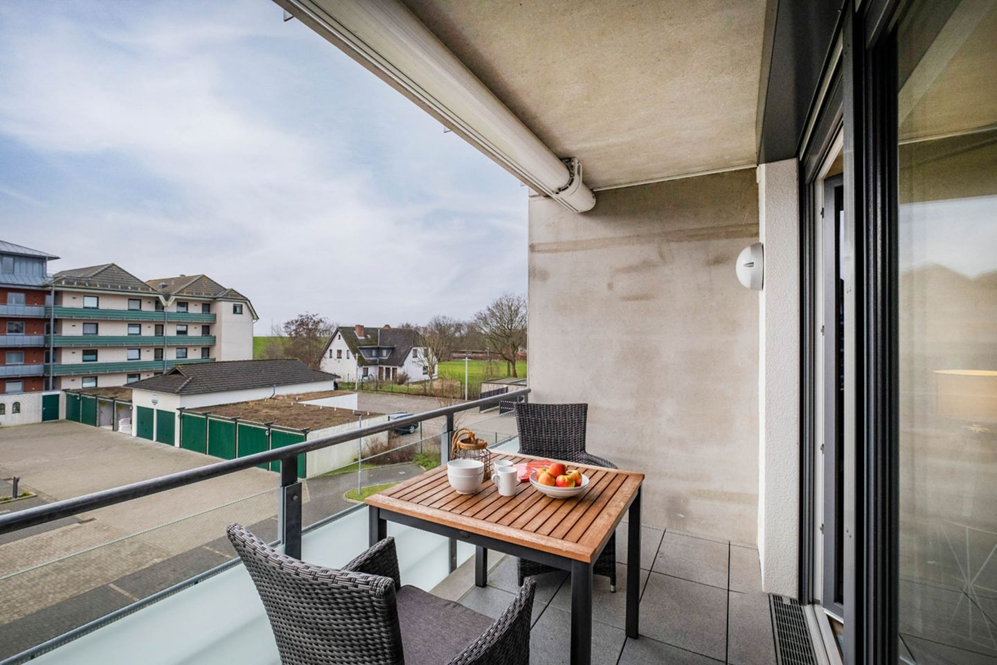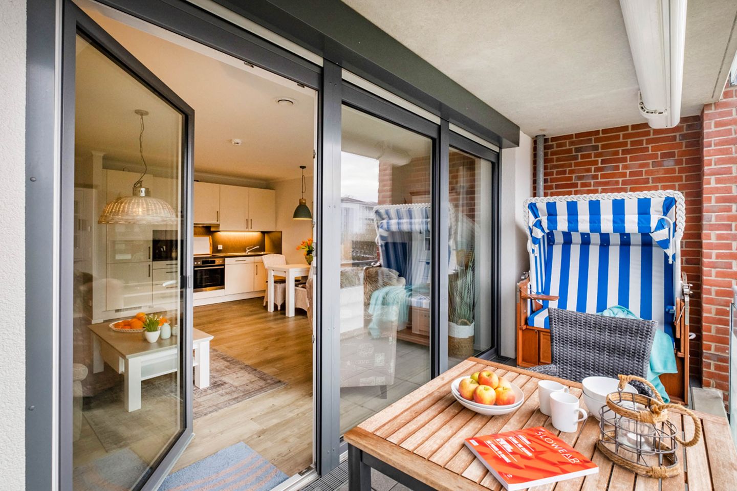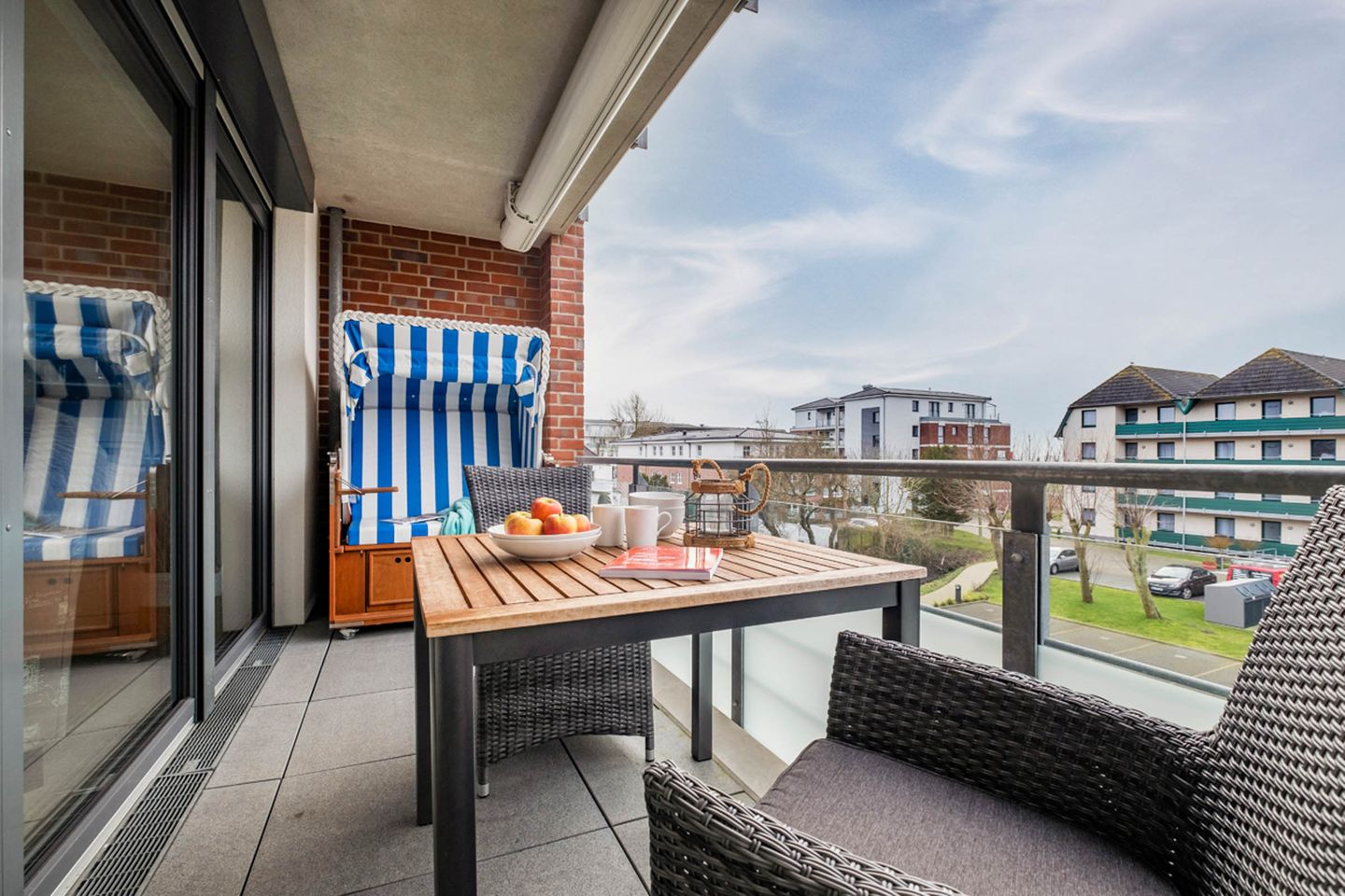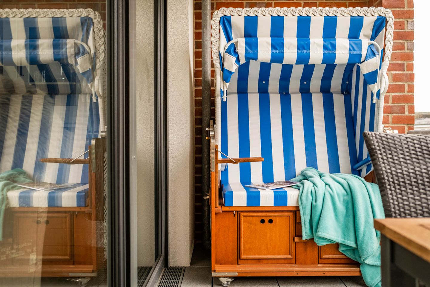 Der Balkon ist bestens ausgestattet mit bequemen Balkonmöbeln und einem Strandkorb.