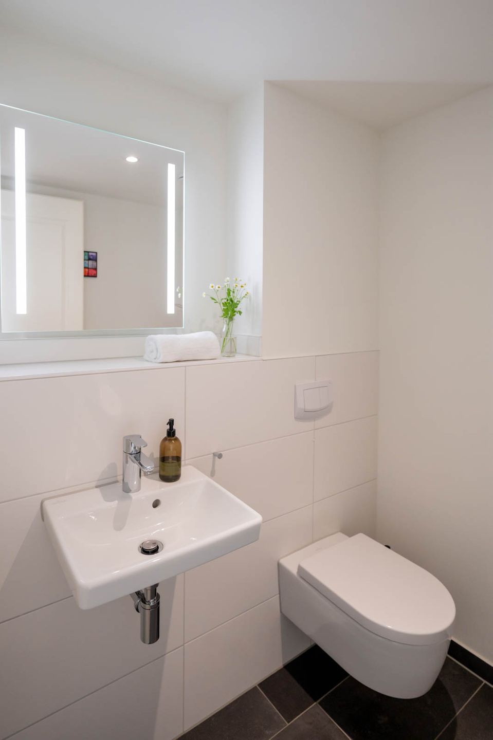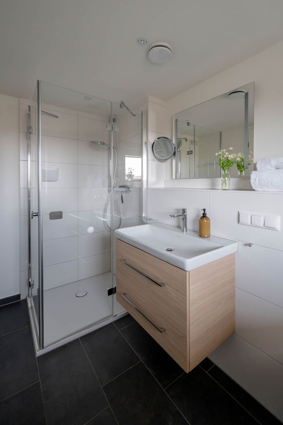 Das Appartement Beeke verfügt über ein großzügiges Badezimmer mit Dusche (Duschkopf verfügt über vier Funktionen), Waschbecken, Handtuchtrockner, Fußbodenheizung, Kosmetikspiegel und WC. Zusätzlich zum Badezimmer verfügt Beeke über ein separates Gäste-WC.