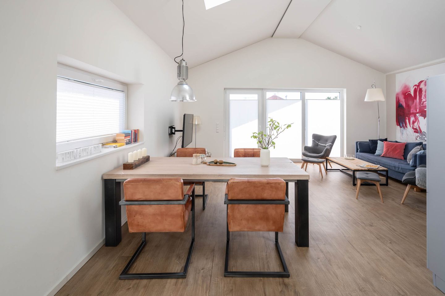Das Wohnzimmer ist der ideale Ort für einen Spielenachmittag, zum Schmökern in der Urlaubslektüre oder für den Filmabend mit der Familie. Das gemütliche Sofa und zwei separate Sessel bieten Platz für alle Mitreisenden und ein Dachfenster sorgt für mehr Licht am Tag und den Blick auf die Sterne bei Nacht.. Niklas Wendt, ein befreundeter Künstler, hat uns für jedes der vier Apartments eins seiner Kunstwerke als Leihgabe überlassen. Kommen Sie für weitere Informationen gerne auf uns zu.
