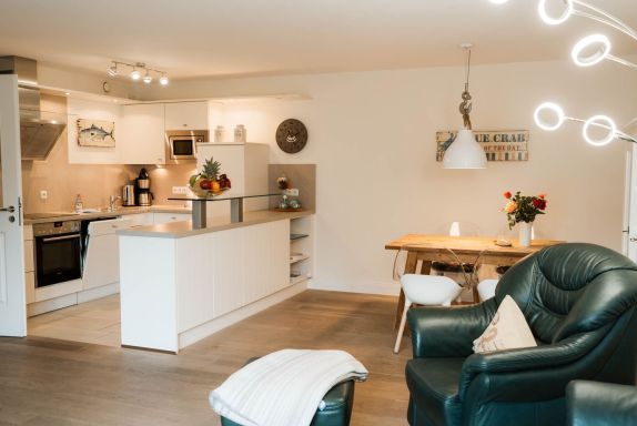 Das Appartement 1.1 befindet sich im Erdgeschoss mit Terrasse. Im Wohnraum finden Sie eine gemütliche Couchgarnitur. Die Küche und der Essbereich sind im Wohnbereich integriert. Beide Schlafzimmer sind mit Doppelbetten ausgestattet. Ein Schlafzimmer mit TV. Das Bad verfügt über eine barrierefreie Dusche, WC und Sauna. Das Appartement verfügt zusätzlich über ein Gäste- WC und einer Abstellkammer. Fußbodenheizung befindet sich im ganzen Appartement. Auf die Terrasse gelangen Sie vom Wohnraum und den Schafzimmern, die in Südlage liegt. Das Appartement verfügt über eine Gegensprechanlage mit Kamera. Im Keller finden Sie Waschmaschine und Trockner (gebührenpflichtig), Abstellraum für Fahrräder und einen gemeinschaftlichen Fitnessraum. Aufzug im Haus. Am Haus finden Sie einen weiteren abschließbaren Fahrradabstellraum und einen kleinen Spielplatz für unsere kleinen Gäste.