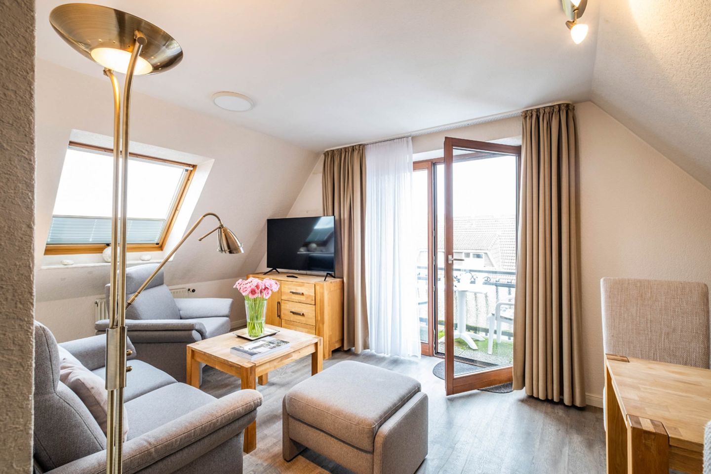 Die Ferienwohnung 8 liegt im Dachgeschoss und verfügt über einen Balkon in Süd-Ost-Lage. Es gibt leider keinen Aufzug im Haus.