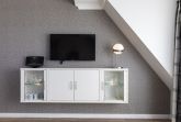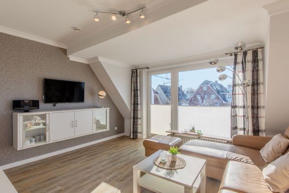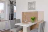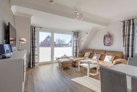 Die Ferienwohnung 6 (46 qm) liegt im 1. Obergeschoss und verfügt über einen Balkon in West-Lage. Es gibt leider keinen Aufzug im Haus.