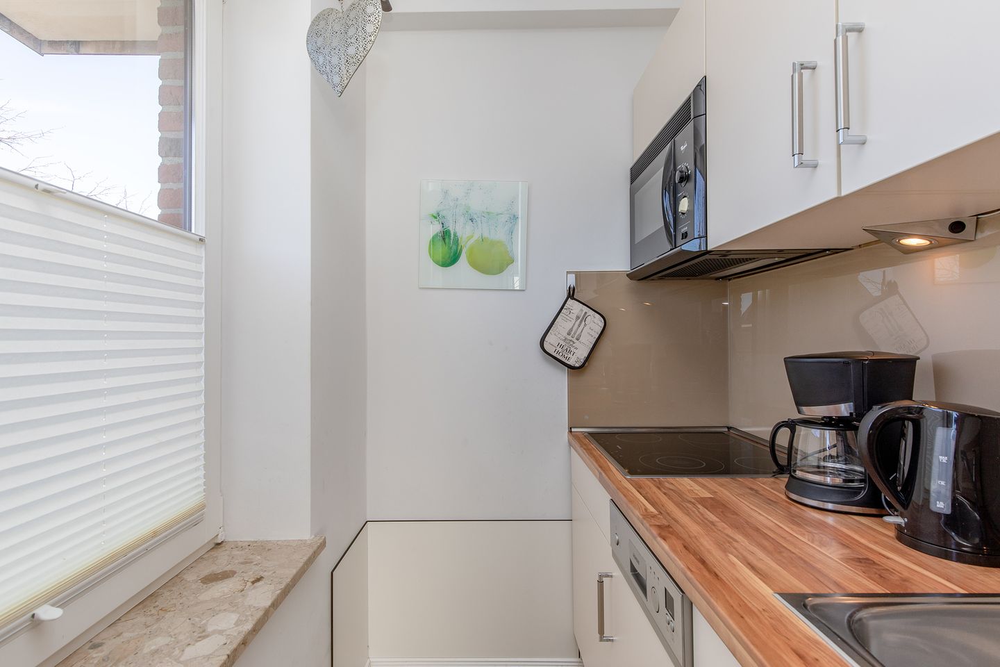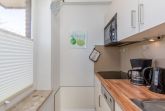 Küchenzeile: Geschirrspüler, Kochfeld, Mikrowelle, Kühlschrank mit Gefrierfunktion, Heißwasserkocher, Kaffeemaschine, Toaster.