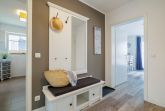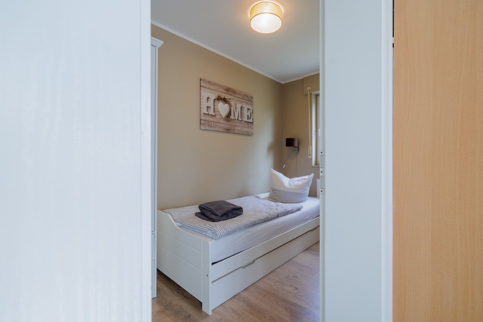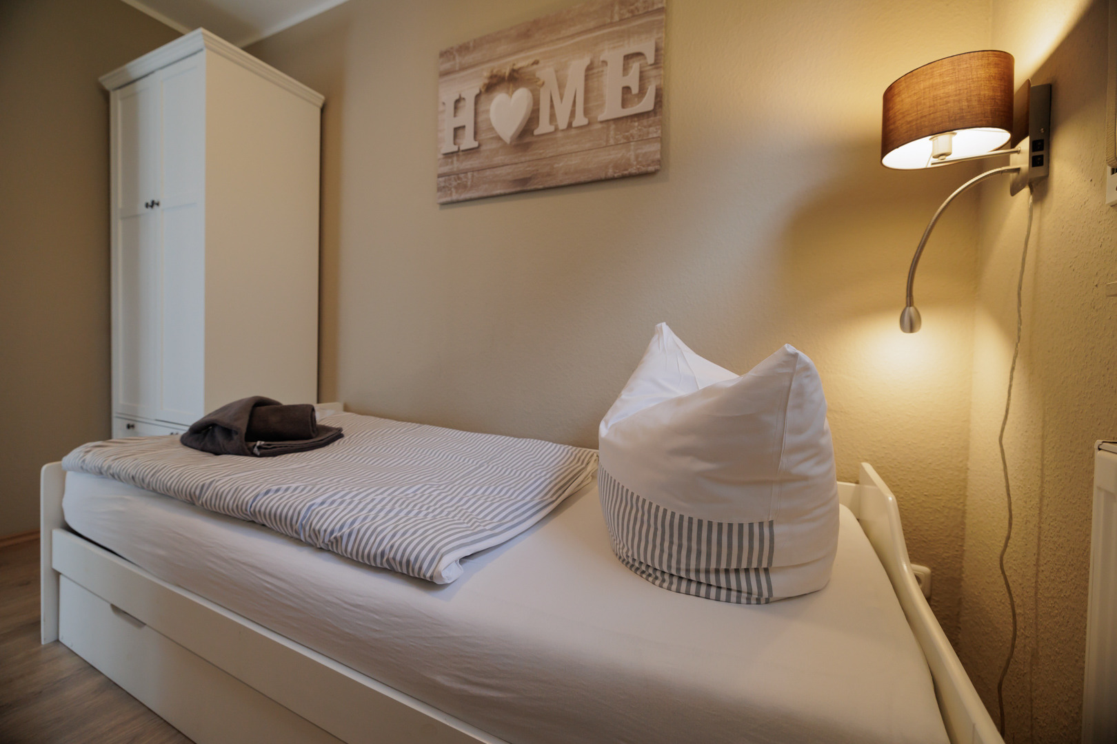 Schlafzimmer mit Wohlfühlfaktor: Ein stilvoll eingerichtetes Schlafzimmer mit komfortablem Doppelbett und sanften, maritimen Farbtönen sorgt für erholsame Nächte.