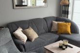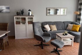 Geräumiger Wohnbereich mit modernem Mobiliar, ideal für gemütliche Abende nach einem Tag am Meer.
