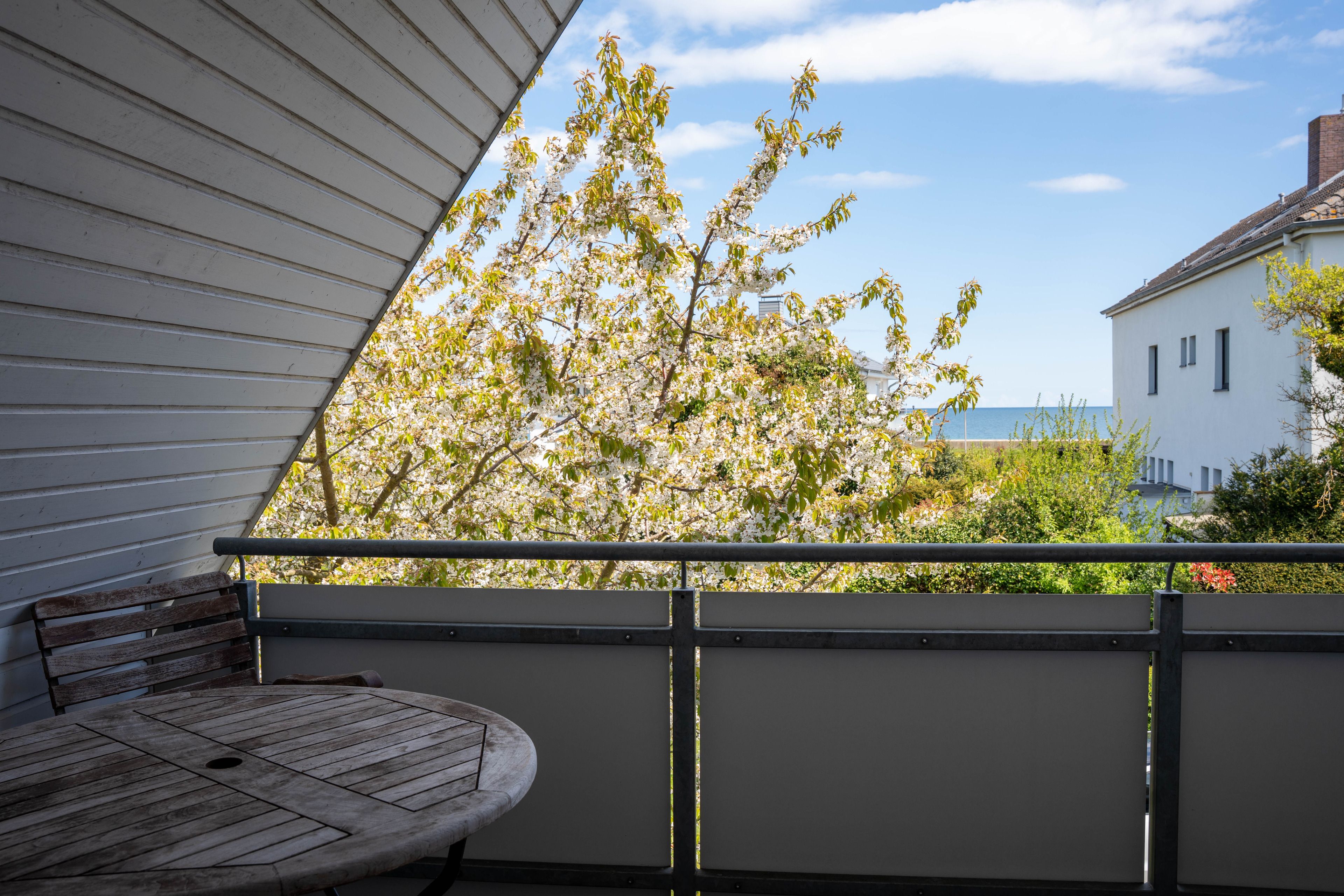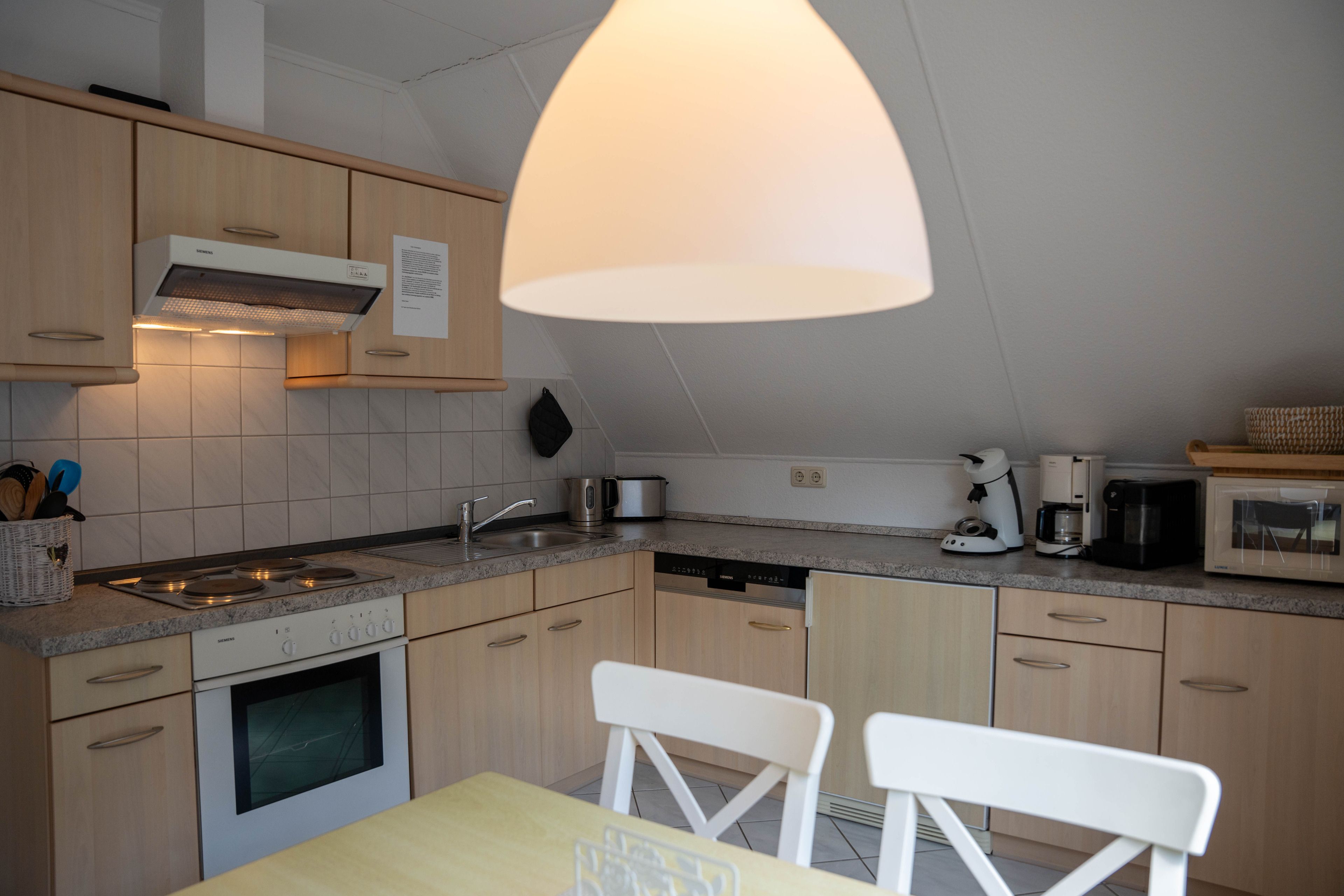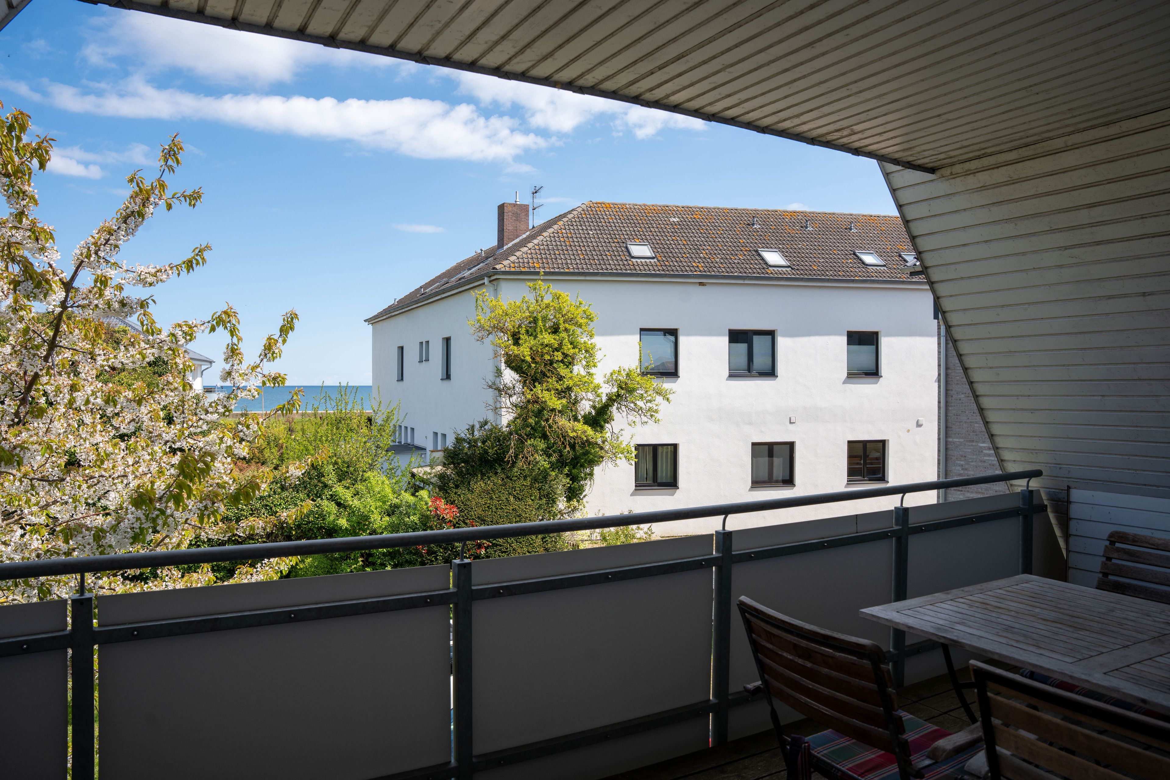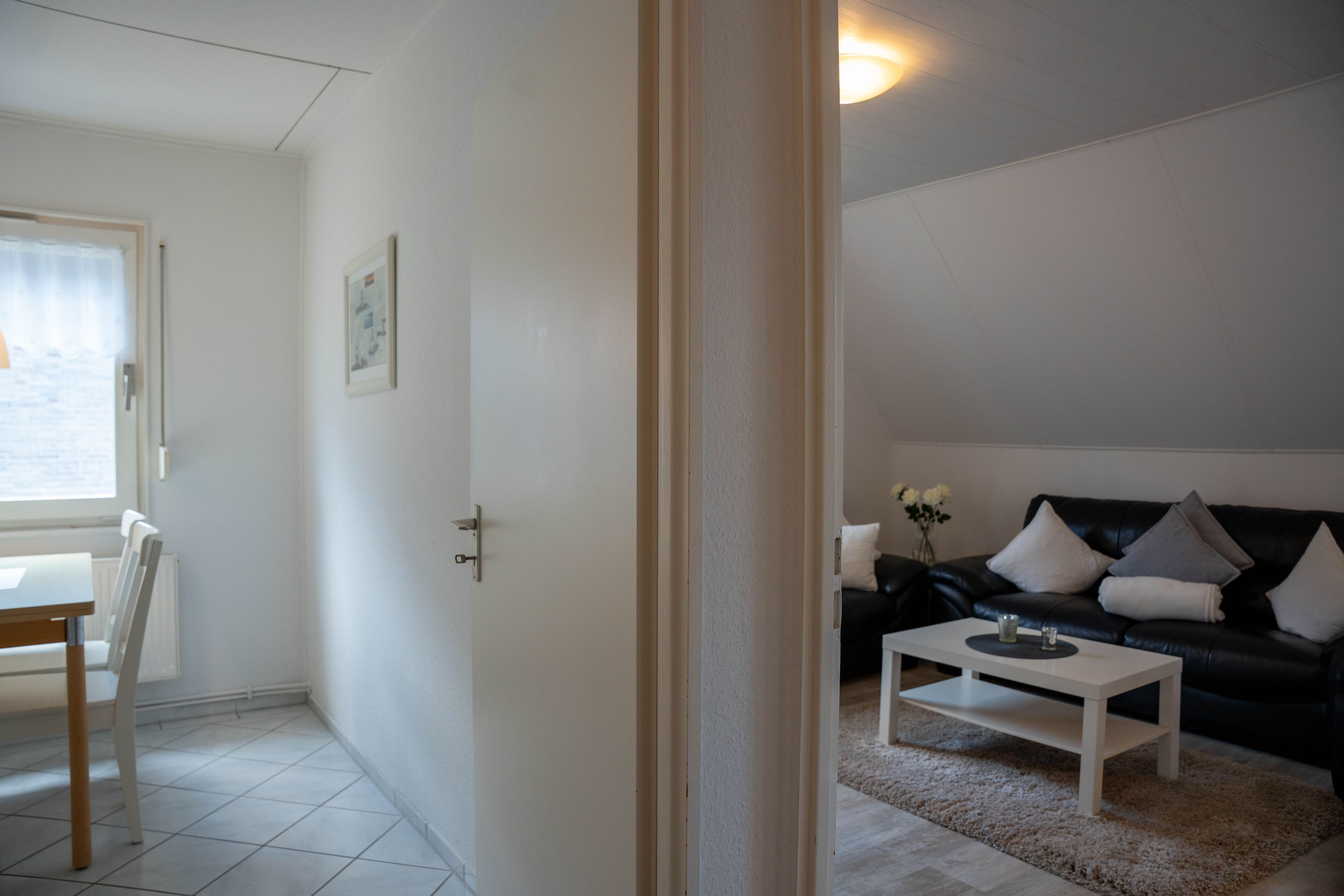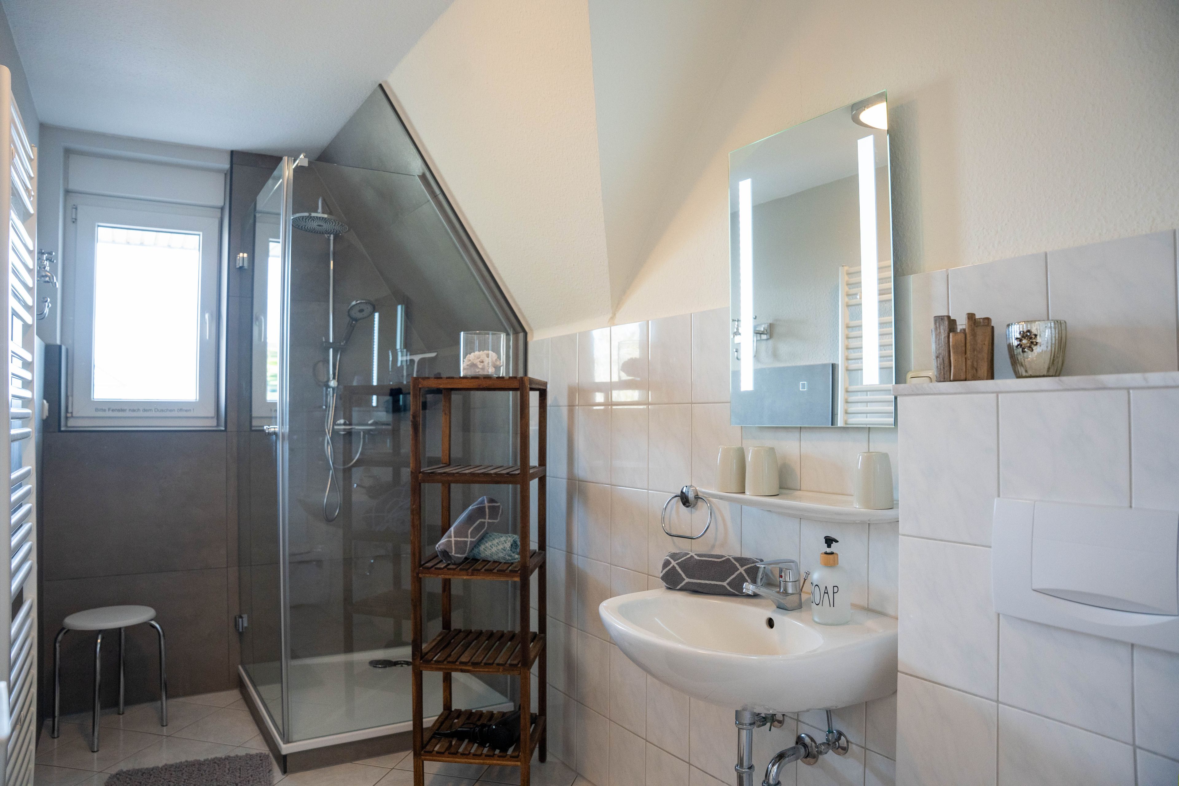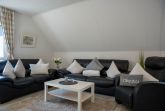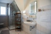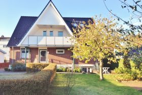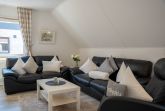 Die ca. 100 qm große Ferienwohnung befindet sich im 1. OG und Dachgeschoss des Hauses. Es stehen Ihnen 2 Elternschlafzimmer im OG und ein komplett neu gestaltetes Schlafzimmer mit gemütlicher Matratzen Schlafcouch (150x200 cm) und Kleiderschrank im Dachgeschoss sowie Meerblick zur Verfügung. Das neu und freundlich gestaltete Wohnzimmer mit 2er und 3er Couch, sowie Sessel und Esstisch wird Sie begeistern. Von hier aus, führt eine Treppe nach oben in das 3. Schlafzimmer mit Meerblick. Die separate Küche ist gut ausgestattet und verfügt über einen kleinen Esstisch mit Bestuhlung. Das Badezimmer ist mit einer Dusche und WC ausgestattet. Auf der zur Seeseite gelegenen 5x2 Meter großen, blickgeschützten Loggia lässt es sich in der Morgensonne gemütlich frühstücken und teilweise den Blick auf die Ostsee genießen. Die Ferienwohnung verfügt über Außenrollläden.