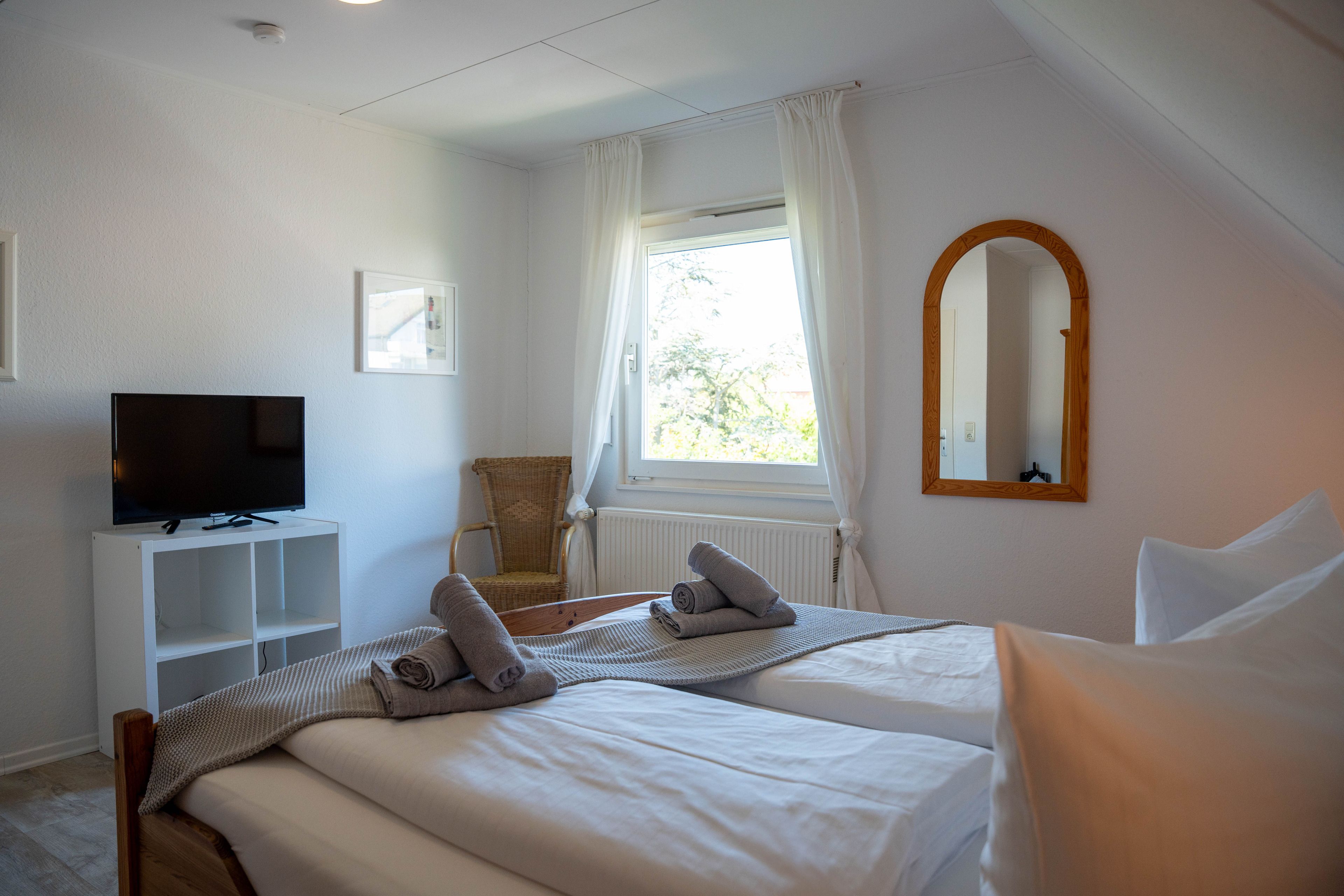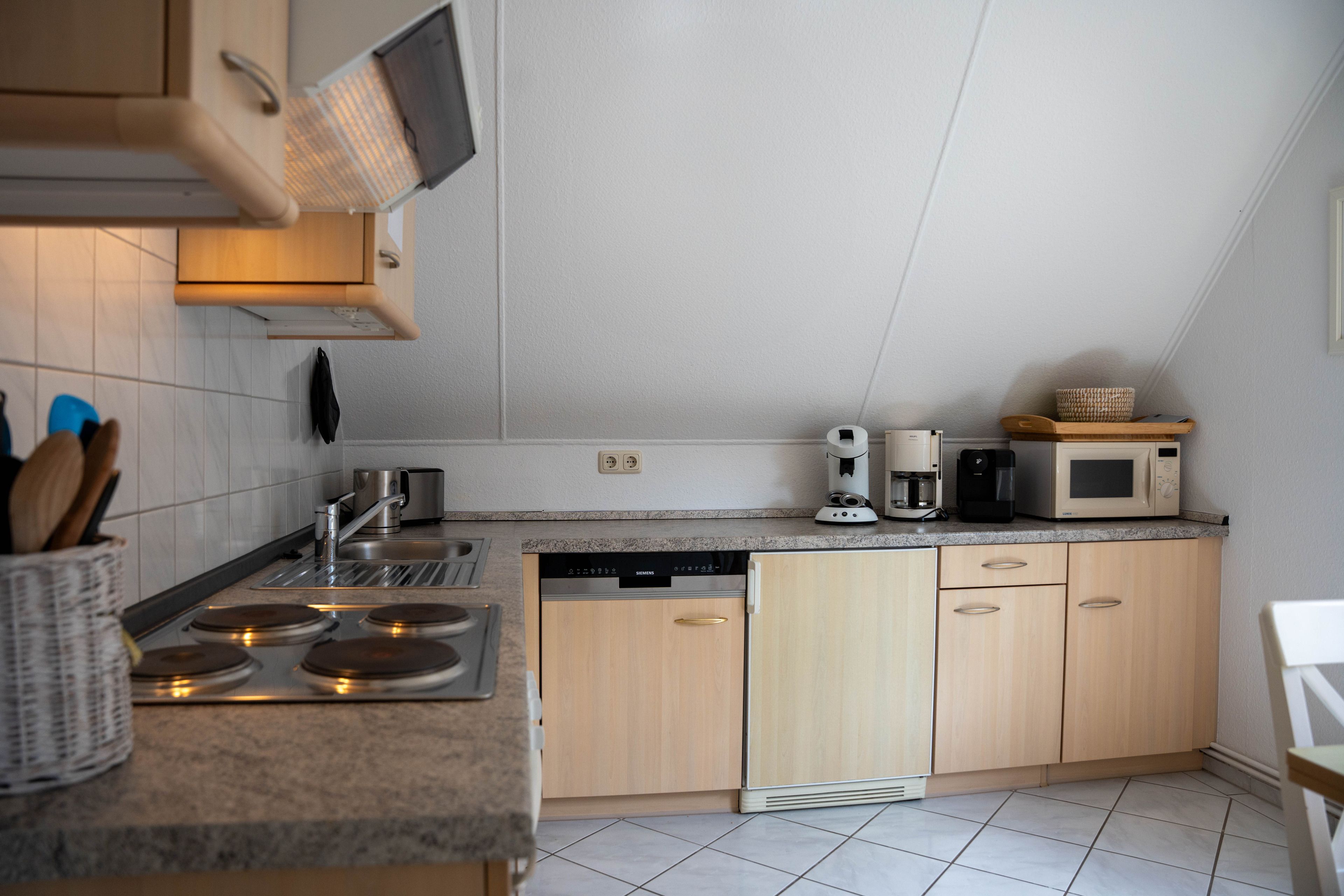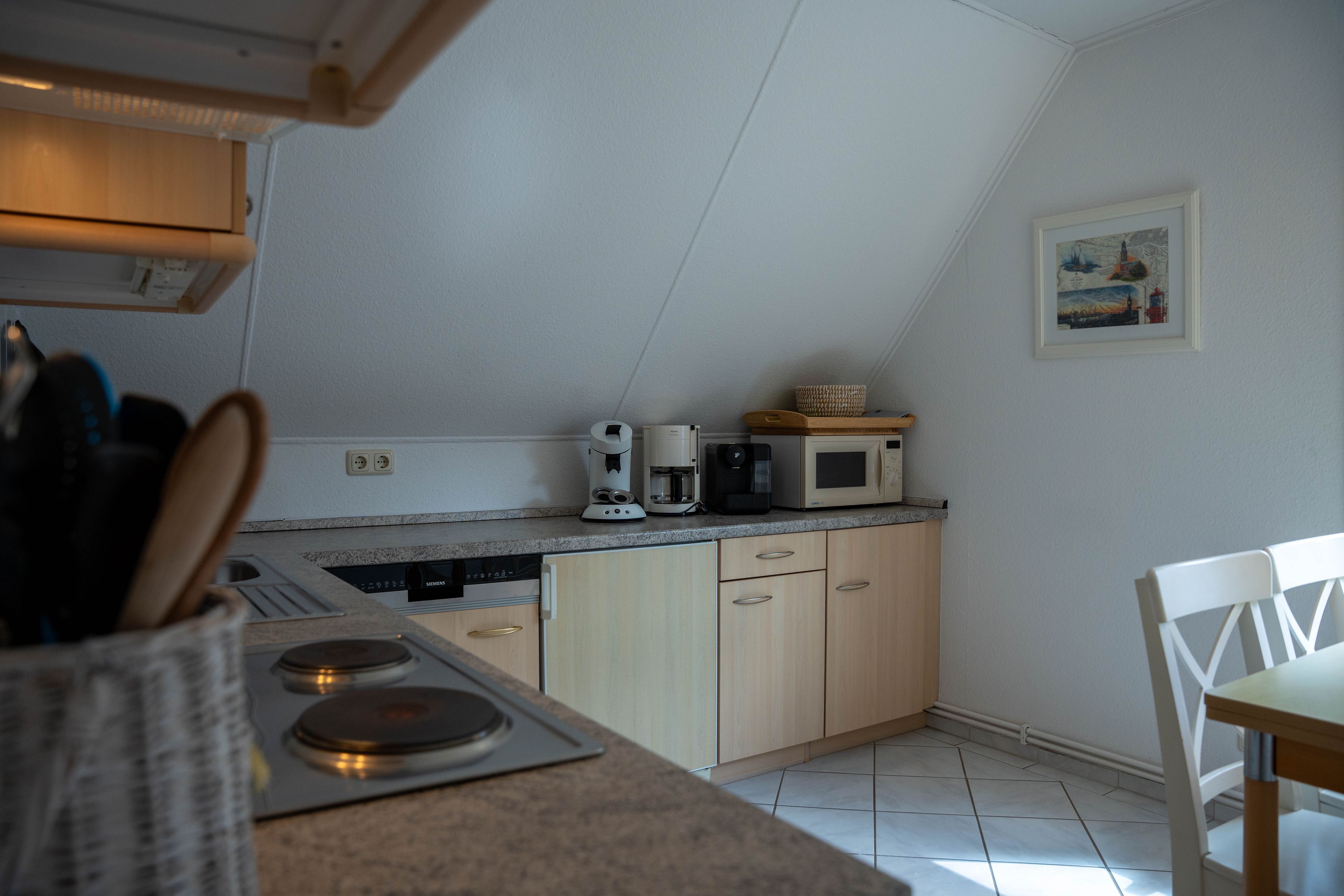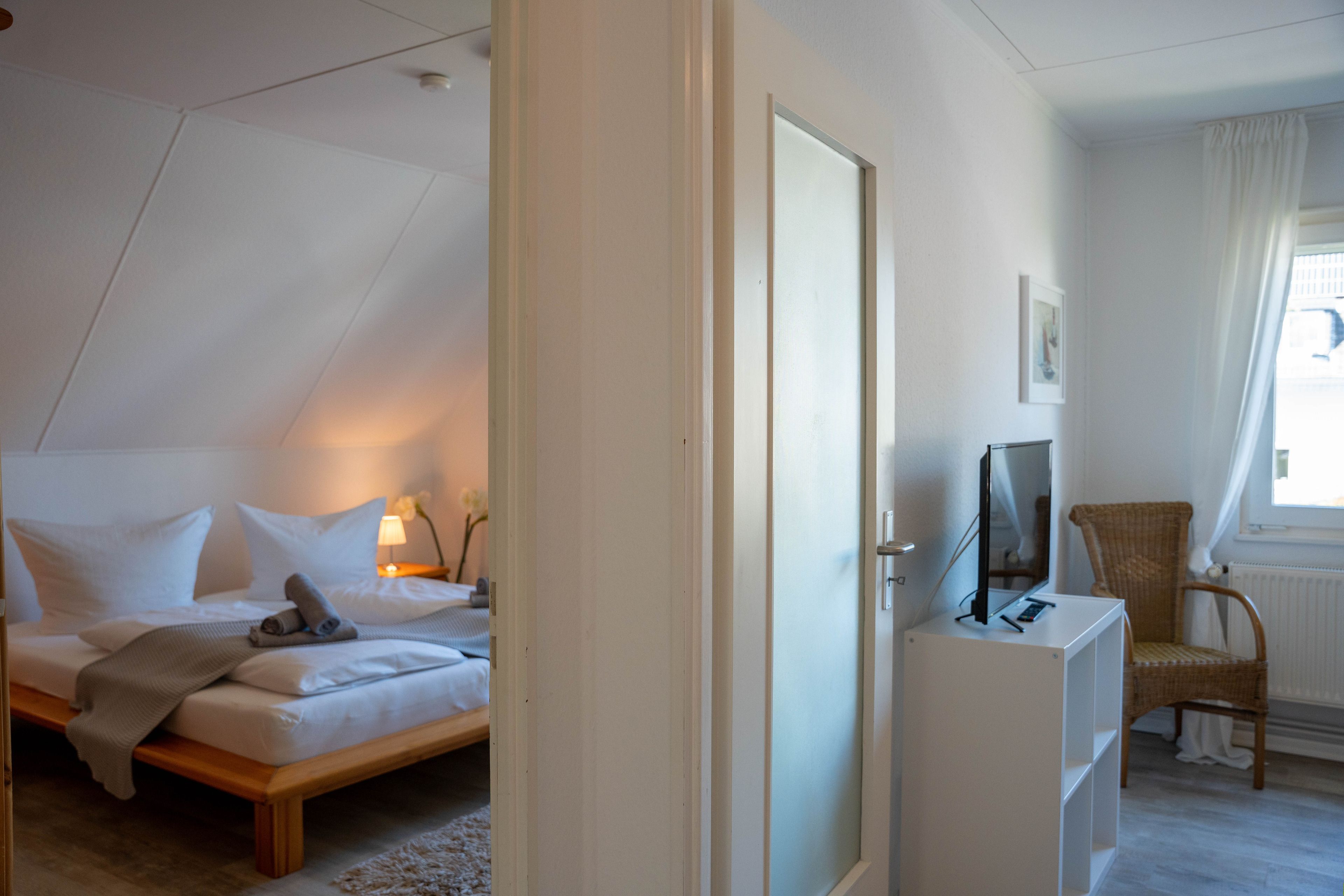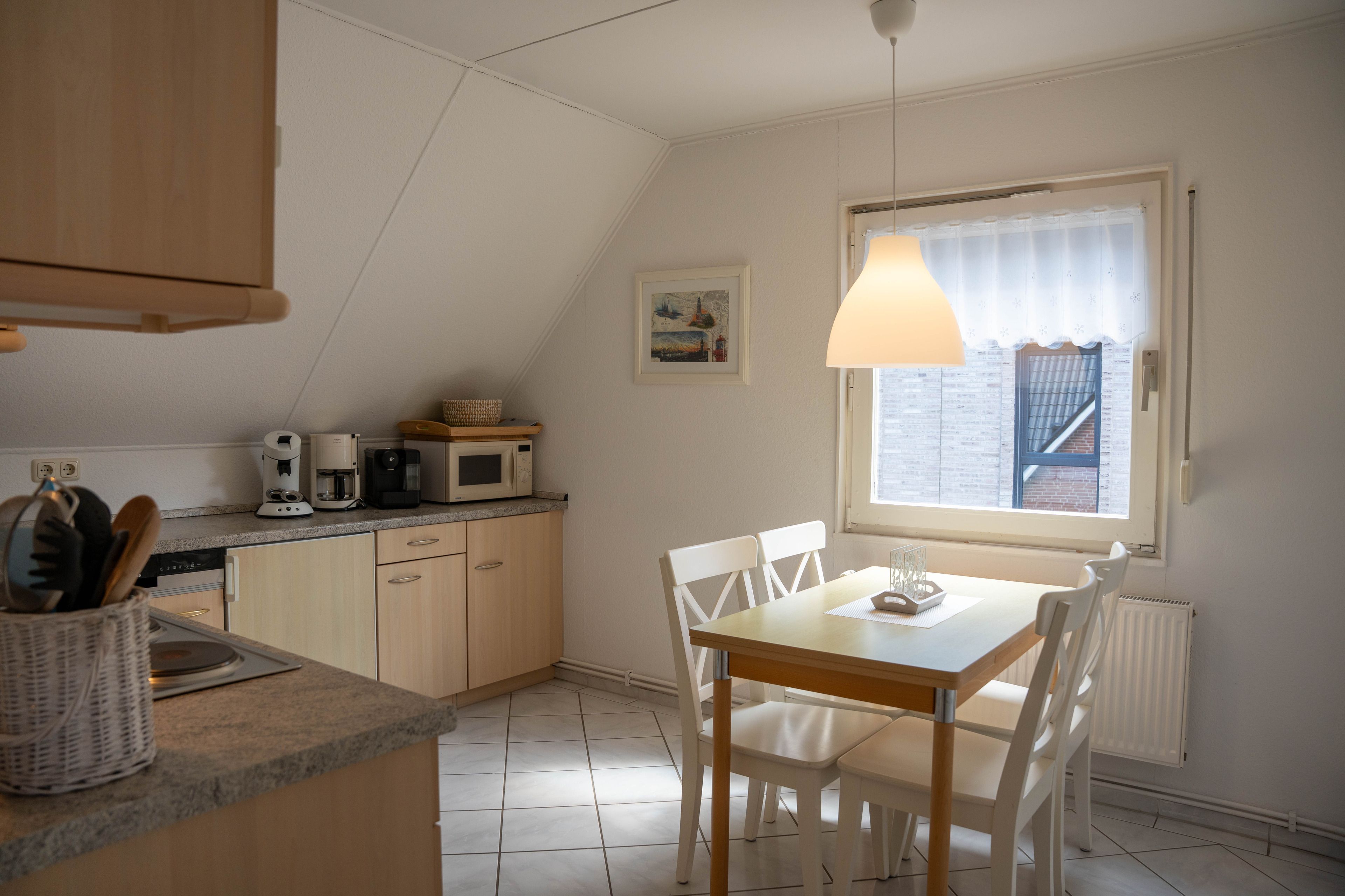 Die ca. 100 qm große Ferienwohnung befindet sich im 1. OG und Dachgeschoss des Hauses. Es stehen Ihnen 2 Elternschlafzimmer im OG und ein komplett neu gestaltetes Schlafzimmer mit gemütlicher Matratzen Schlafcouch (150x200 cm) und Kleiderschrank im Dachgeschoss sowie Meerblick zur Verfügung. Das neu und freundlich gestaltete Wohnzimmer mit 2er und 3er Couch, sowie Sessel und Esstisch wird Sie begeistern. Von hier aus, führt eine Treppe nach oben in das 3. Schlafzimmer mit Meerblick. Die separate Küche ist gut ausgestattet und verfügt über einen kleinen Esstisch mit Bestuhlung. Das Badezimmer ist mit einer Dusche und WC ausgestattet. Auf der zur Seeseite gelegenen 5x2 Meter großen, blickgeschützten Loggia lässt es sich in der Morgensonne gemütlich frühstücken und teilweise den Blick auf die Ostsee genießen. Die Ferienwohnung verfügt über Außenrollläden.