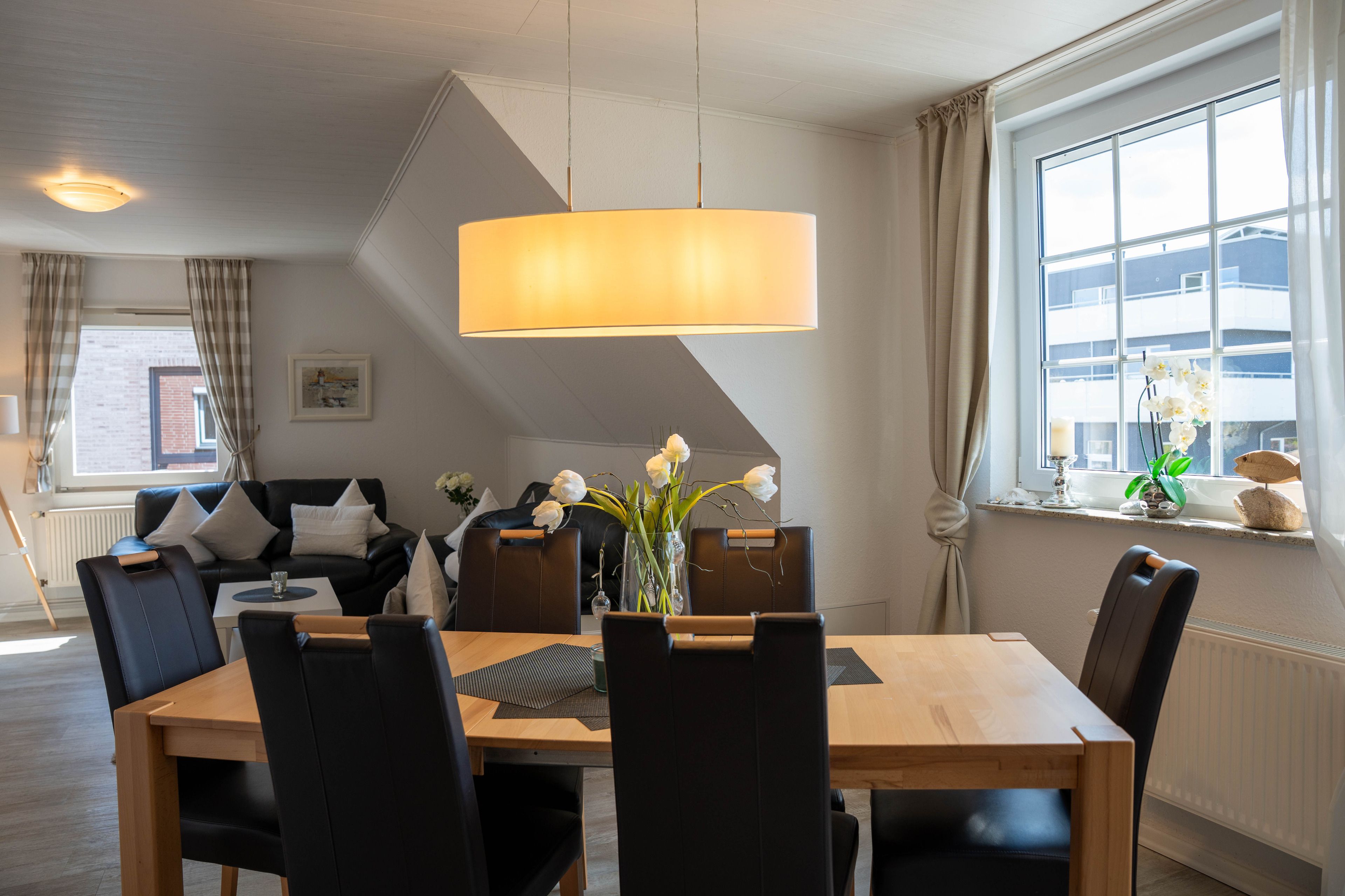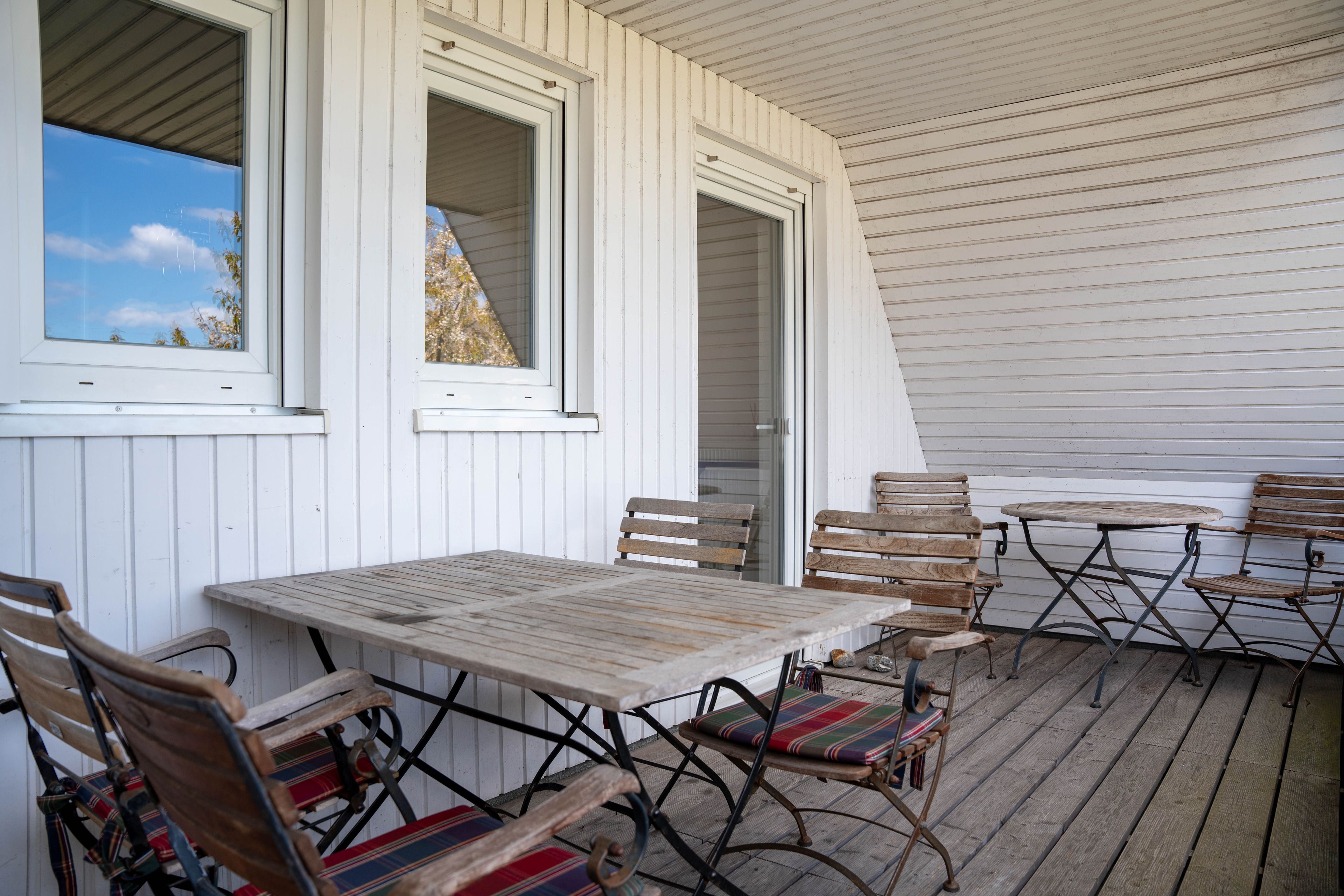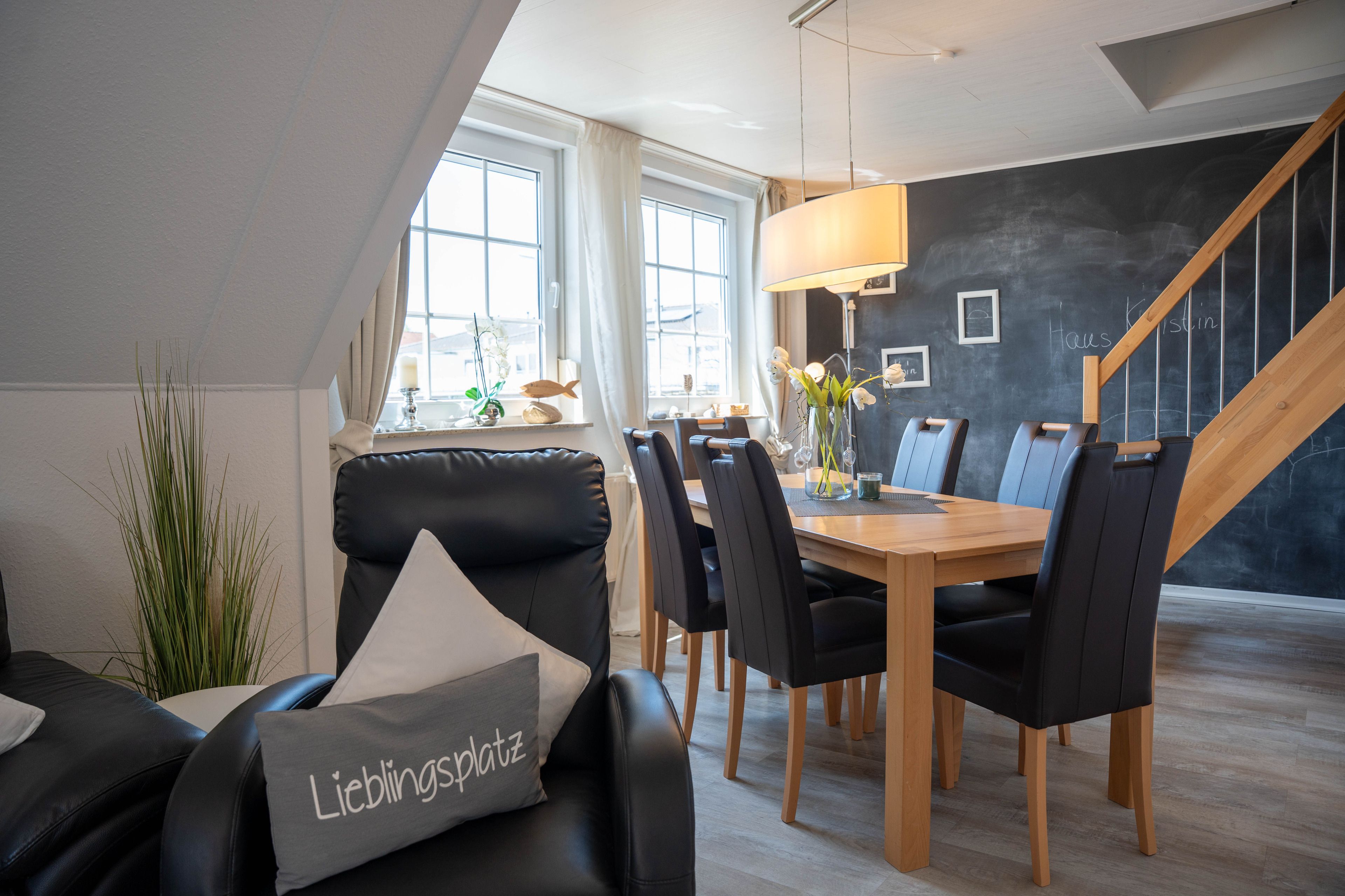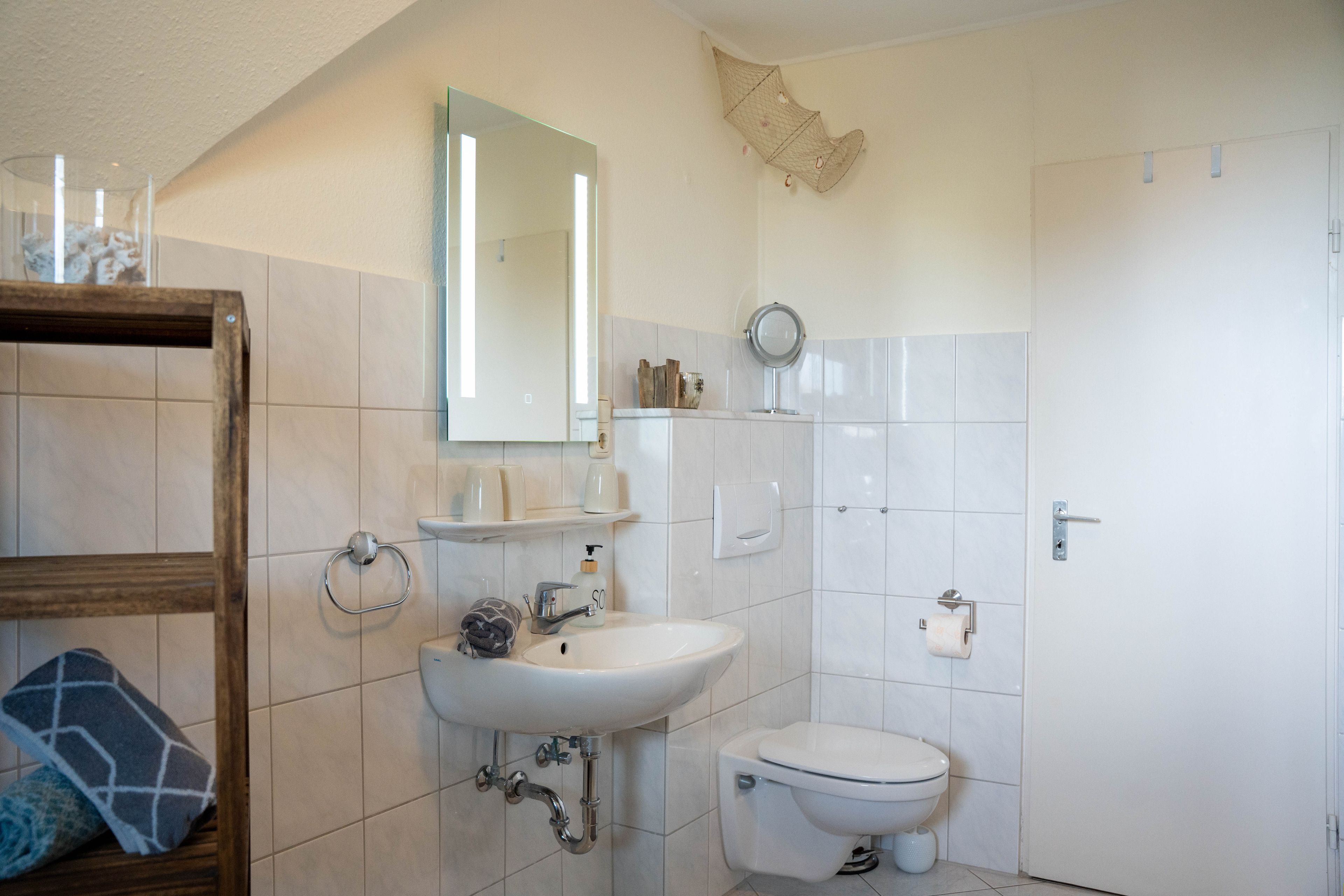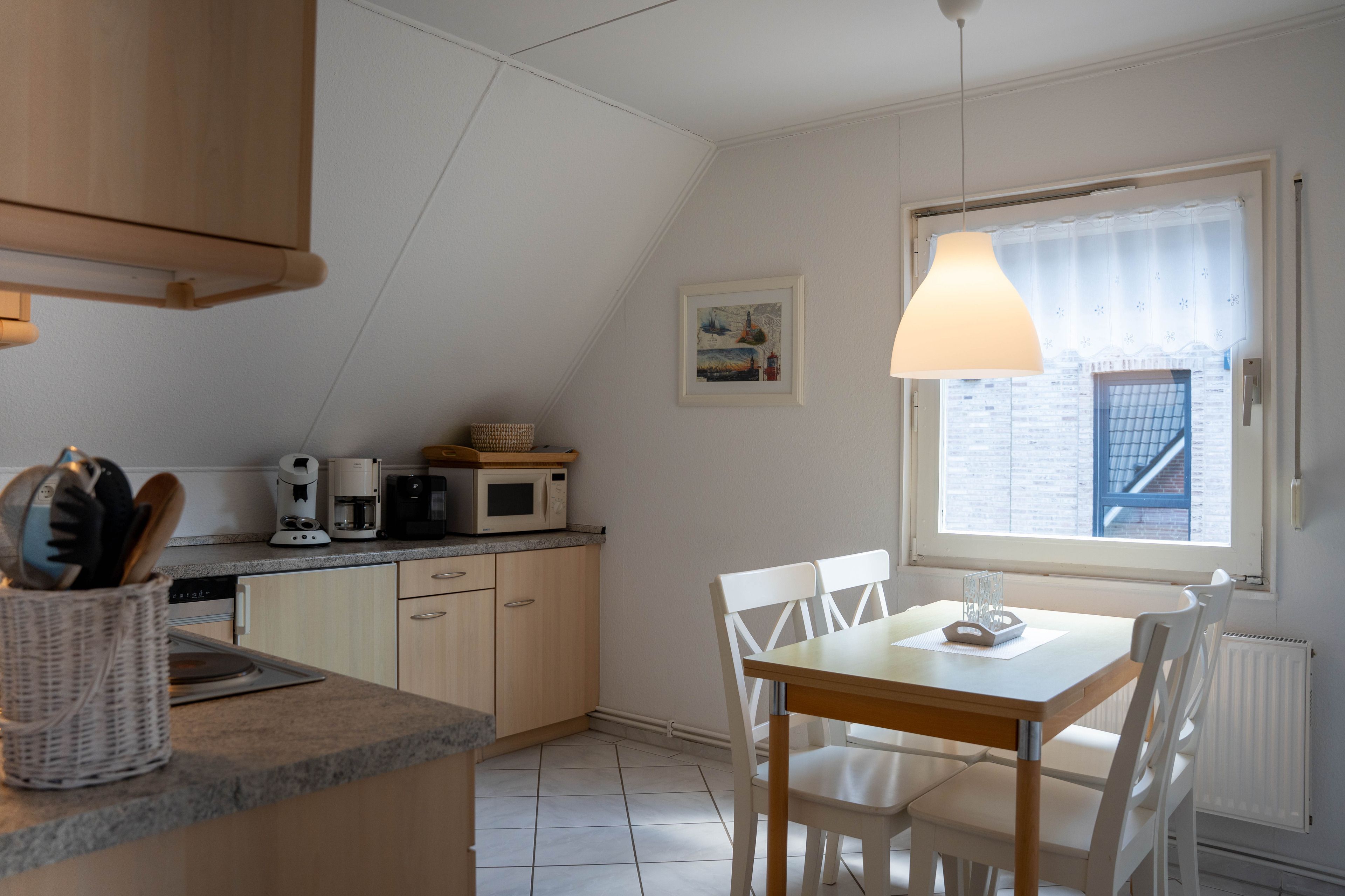 Die ca. 100 qm große Ferienwohnung befindet sich im 1. OG und Dachgeschoss des Hauses. Es stehen Ihnen 2 Elternschlafzimmer im OG und ein komplett neu gestaltetes Schlafzimmer mit gemütlicher Matratzen Schlafcouch (150x200 cm) und Kleiderschrank im Dachgeschoss sowie Meerblick zur Verfügung. Das neu und freundlich gestaltete Wohnzimmer mit 2er und 3er Couch, sowie Sessel und Esstisch wird Sie begeistern. Von hier aus, führt eine Treppe nach oben in das 3. Schlafzimmer mit Meerblick. Die separate Küche ist gut ausgestattet und verfügt über einen kleinen Esstisch mit Bestuhlung. Das Badezimmer ist mit einer Dusche und WC ausgestattet. Auf der zur Seeseite gelegenen 5x2 Meter großen, blickgeschützten Loggia lässt es sich in der Morgensonne gemütlich frühstücken und teilweise den Blick auf die Ostsee genießen. Die Ferienwohnung verfügt über Außenrollläden.