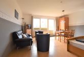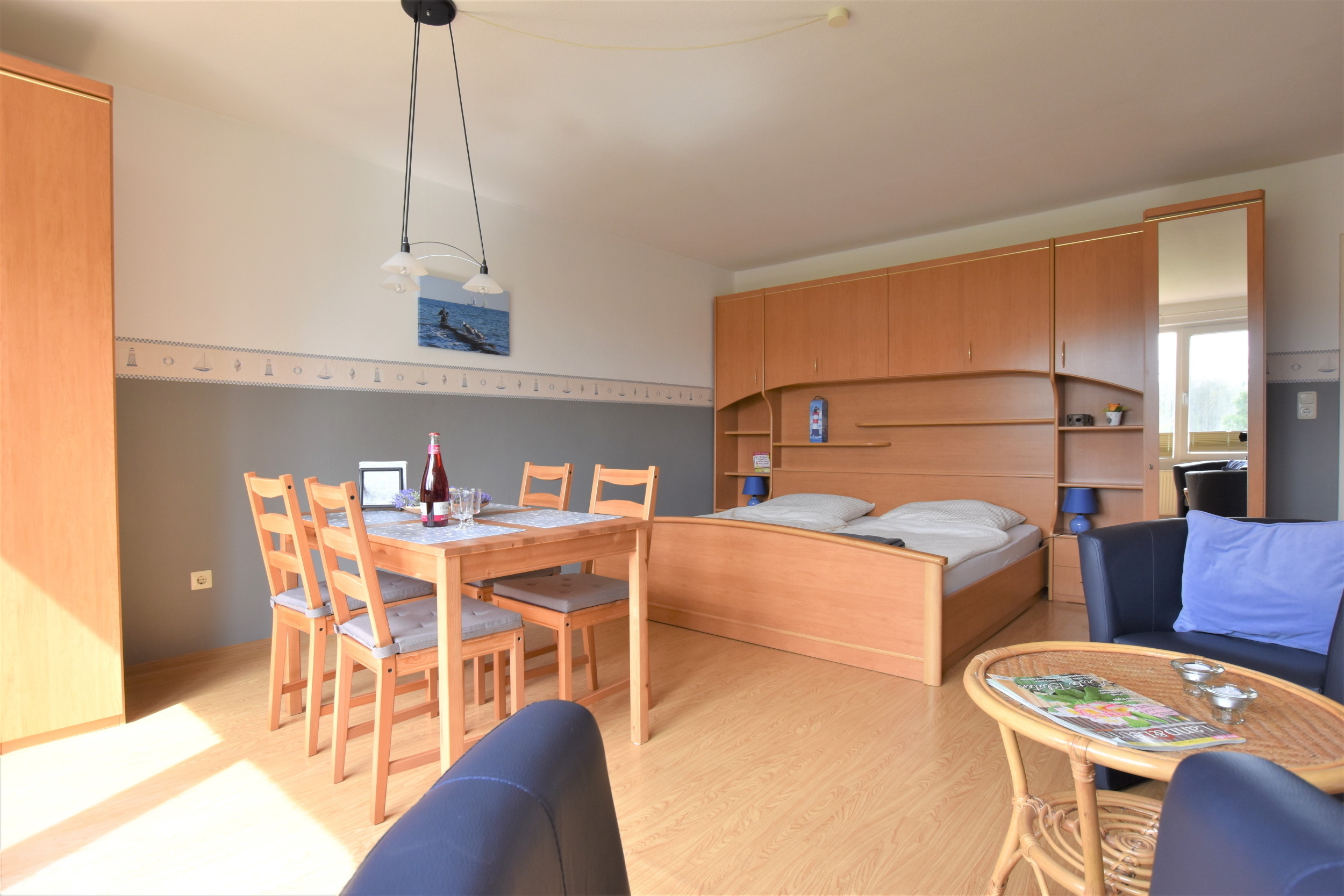 Das Wohn-/Schlafzimmer ist mit einem Doppelbett, einer gemütlichen Sitzecke sowie einem Essbereich versehen - von hier aus gelangen Sie auf den möblierten Balkon.