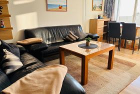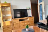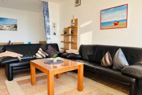 Die gemütliche Nichtraucher-Ferienwohnung verfügt über einen Balkon. Das Wohnzimmer, mit Balkon zur Seeseite, ist mit einer Sitzgarnitur, einem separaten Essplatz und SAT-TV ausgestattet. Das Wohn-Schlafzimmer ist mit einem Doppelbett versehen und im extra Kinderzimmer befindet sich ein Etagenbett. Die Küche ist vollständig ausgestattet, inklusive eines 4-Platten-Cerankochfelds, Backofen, Kaffeemaschine, Wasserkocher und weiteren Kleingeräten.