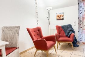 Die Ferienwohnung im Ostseebad Dahme liegt in der 1. Etage und verfügt über einen Wohnschlafraum mit Schrankbett (2x90x200), 2 bequemen Sesseln, Couchtisch, kleinem Esstisch mit Bestuhlung und integrierter, neuer Küche.
