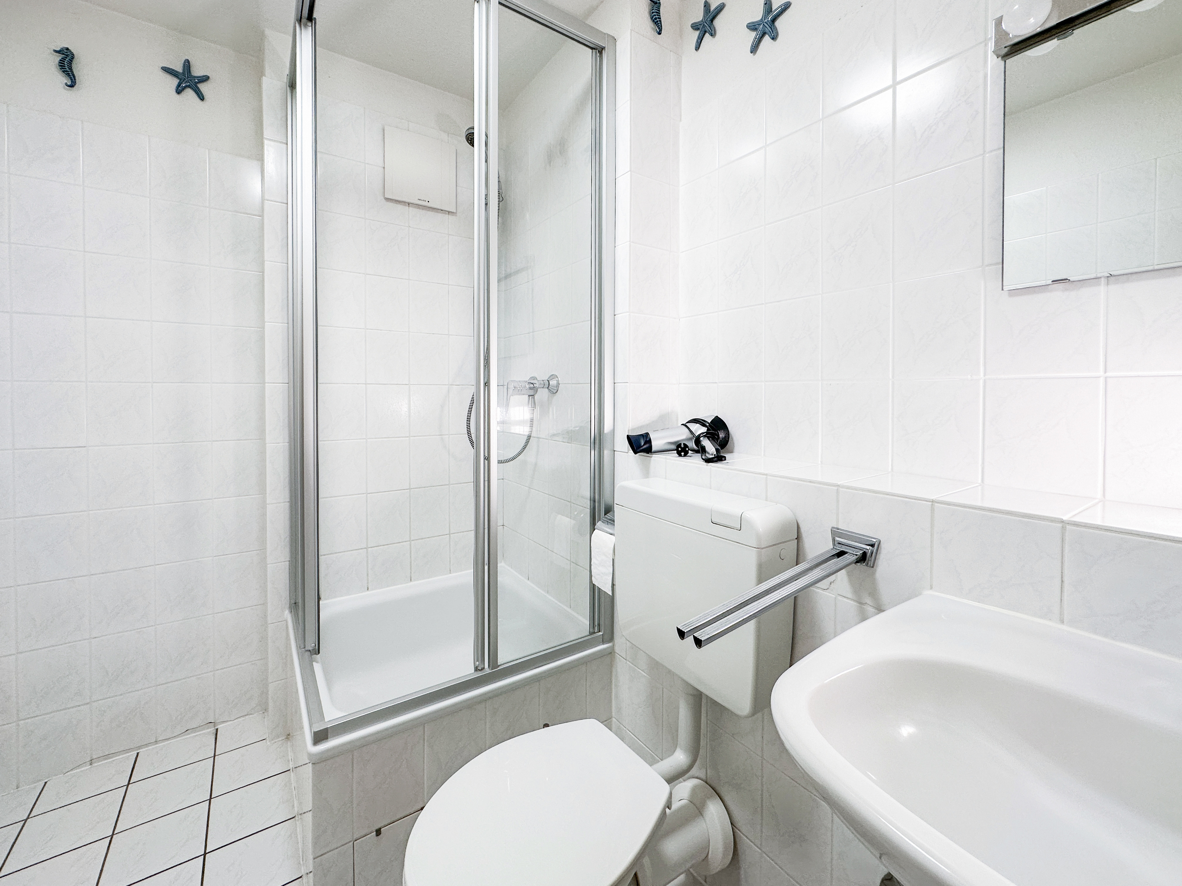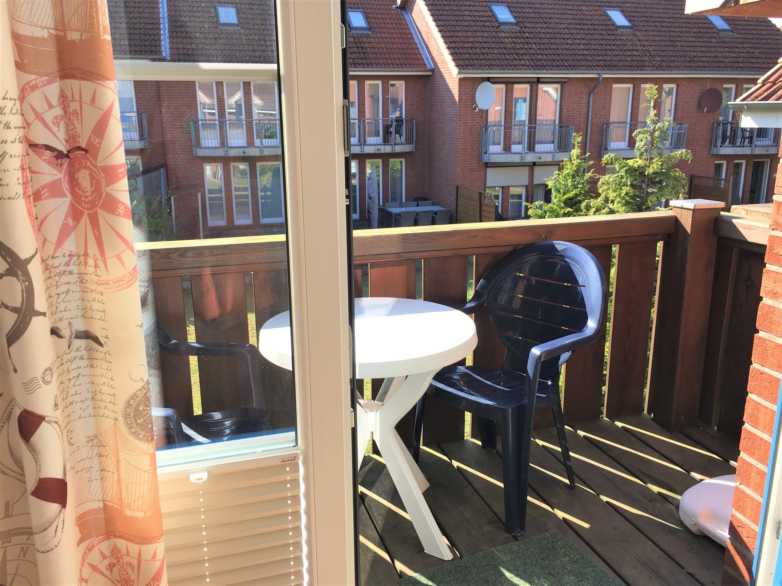 Der Dielenbereich ist ausgestattet mit einer Garderobe und einem 2-türigen Kleiderschrank. Zudem verfügt die gemütliche Ferienwohnung über ein Bad mit Dusche und WC sowie einen möblierten Balkon.