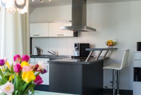 Die zum Wohnbereich offene Küche mit wunderschönem Tresenelement und Zugang zur Dachterrasse ist natürlich mit allen modernen technischen Geräten (Herd,Backofen,Mikrowelle,Kaffeemaschine,Toaster,Wasserkocher etc.) ausgestattet,so dass auch Hobbyköche auf ihre Kosten kommen.