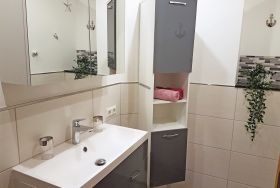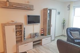 Im Wohnbereich befindet sich ein großer Flachbild-Fernseher, ein 3-Sitzer, 2-Sitzer-Sofa mit Sessel sowie ein Essplatz mit 4 Stühlen. Vom Wohnzimmer gelangen Sie auf den Balkon. Die offene Küche verfügt über ein 4er Ceranfeldherd, Mikrowelle sowie alle wichtigen Küchenutensilien. Das Schlafzimmer ist mit einem Doppelbett (Matratzen 90X200), großzügigem Kleiderschrank, Flachbild-TV (nicht alle Programme verfügbar), Plissees und Verdunkelungsvorhängen ausgestattet. Der Balkon ist ebenfalls vom Schlafzimmer her begehbar. Angrenzend an das Elternschlafzimmer befindet sich mit einer Glasschiebetür das Kinderzimmer. Hier steht ein 140X200 Bett. Das Badezimmer besteht aus einer extra großen, modernen Dusche, modernem Waschtisch sowie einem Hochschrank. Abgehend vom Flur finden Sie das frisch renovierte WC mit Waschtisch und Hochschrank. Die Wohnung verfügt über WLAN. Für Sie gibt es einen eigenen Pkw-Stellplatz sowie auch Fahrradstellplätze sind vorhanden. Den nächsten Supermarkt und Bäcker erreichen Sie in weniger als 5 Gehminuten; bis zum Strand sind es ca. 13 Gehminuten. Der beliebte Zoo Arche Noah befindet sich gegenüber und ein Golfplatz ist ca. 1 km von der Wohnung entfernt. Wir bitten um Verständnis, dass hier keine Haustiere erlaubt sind. Es handelt sich um eine Nichtraucherwohnung.