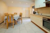 Über eine Aussentreppe kommt man in die helle, große Ferienwohnung und befindet sich direkt im Wohn- und Essbereich. Hier sind zwei gemütliche Ledersofas, Couchtisch, Kommode mit TV und ein integrierter Küchenbereich mit Tisch und 6 Stühlen sowie Zugang zur Aussentreppe mit kleiner Sitzgelegenheit (kleiner Balkon).