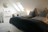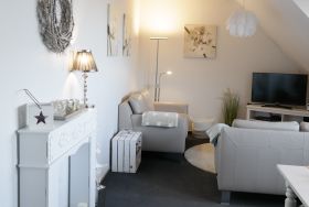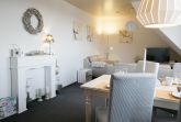 Großzügig gestaltete Wohnung mit offener Küche, Wohn-/Essbereich und zwei separaten Schlafzimmern mit Boxspringbetten und Ausblick auf die Ostsee.