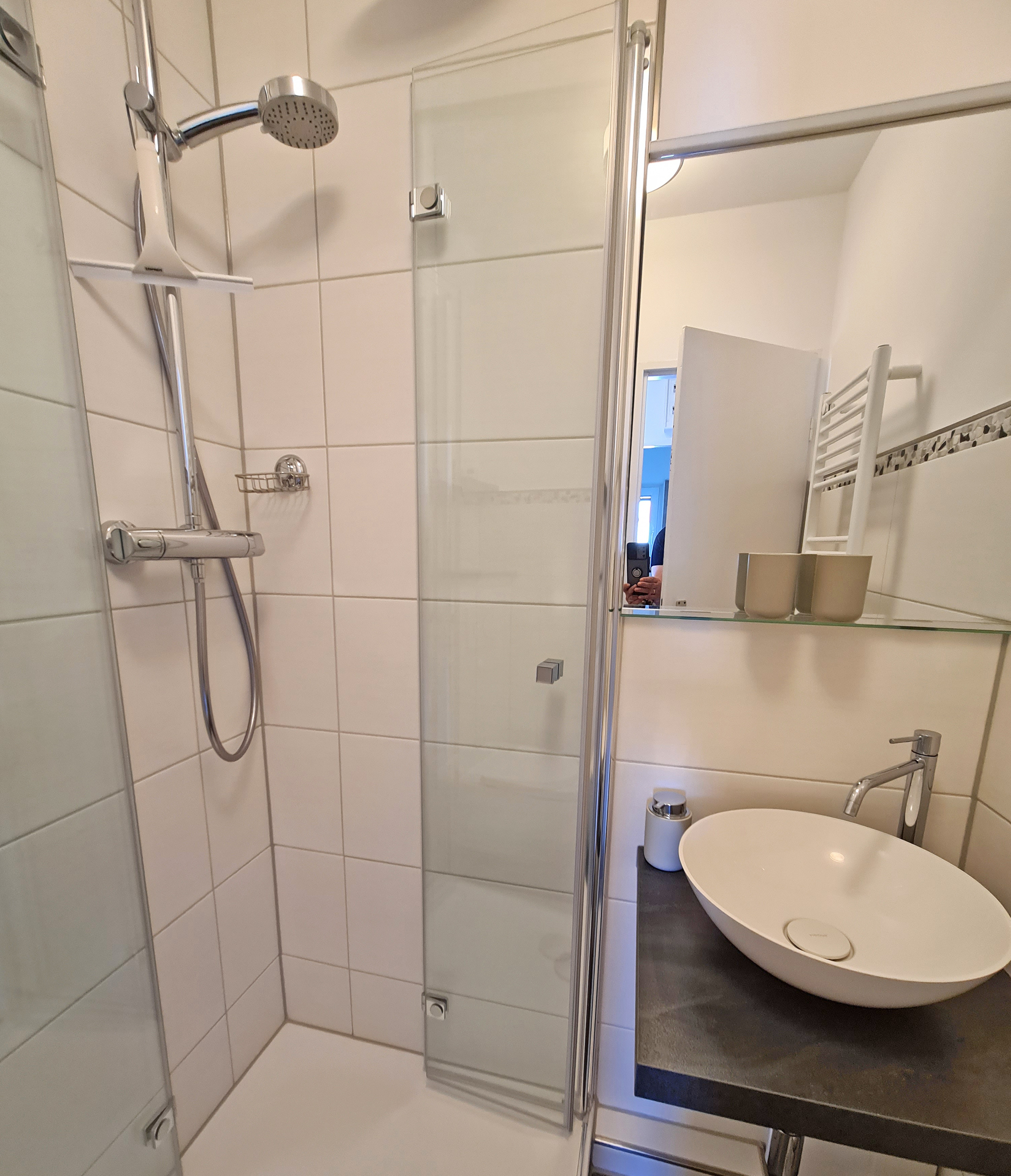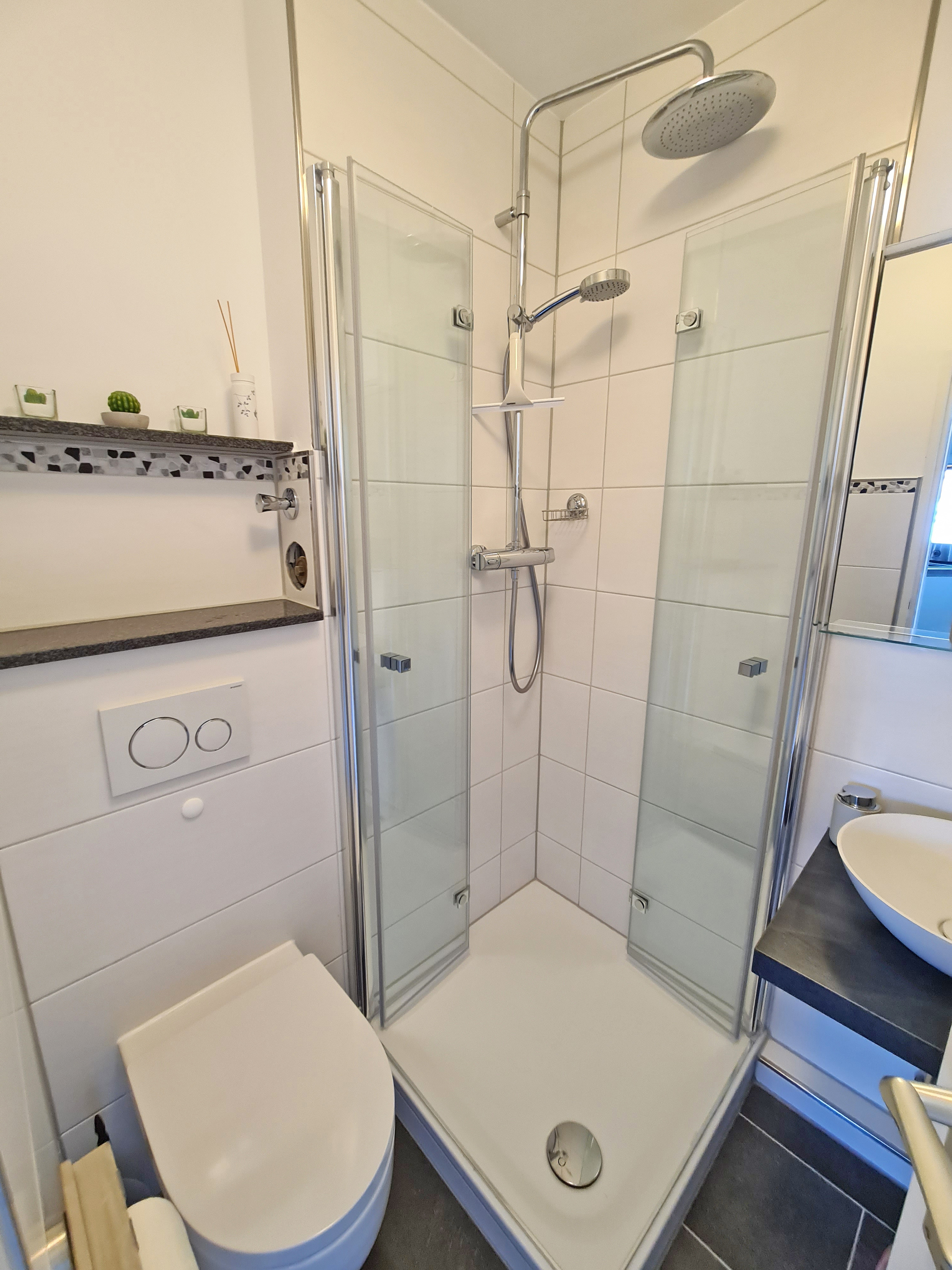 Von dem Flur gelangen Sie in die separate, renovierte Küche. Diese ist mit allen Annehmlichkeiten wie Spülmaschine, Backofen, Mikrowelle etc. gut ausgestattet. Im neu gefliesten Duschbad stehen Ihnen eine Dusche, WC, Waschbecken und ein Spiegel zur Verfügung. Im hellen Wohn-Schlafbereich gibt es ein Schrankbett (2x90x200), eine Couch, zwei Sessel, einen ausziehbaren Esstisch sowie einen kleinen Flachbildfernseher. Genießen Sie bereits zum Frühstück die Sonne auf Ihrem Balkon. Ein neuer bequemer Strandkorb auf dem Balkon steht Ihnen zur Verfügung.