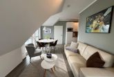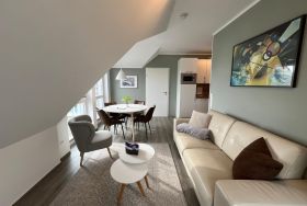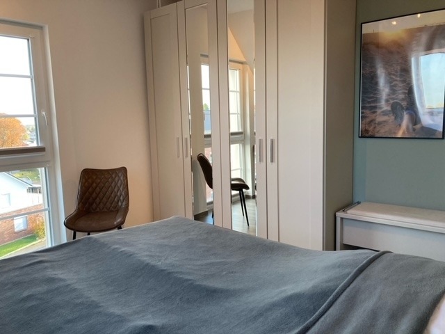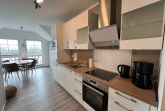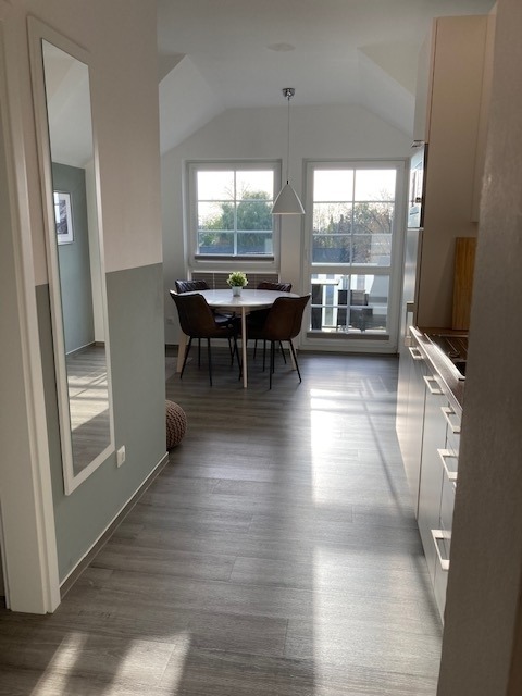 Es erwartet Sie eine gemütliche Dachgeschosswohnung mit traumhaftem Blick über Grömitz mit Blick bis zur Ostsee. Der Wohn-/Essbereich mit leichten Dachschrägen ist mit einem großen gemütlichen Esstisch und 6 Stühlen sowie einer hochwertigen Wohn/Schlafcouch (Liegefläche 160cm x 190cm) für zwei Personen ausgestattet. Die offene Küche ist eine moderne und voll ausgestattete Einbauküche.