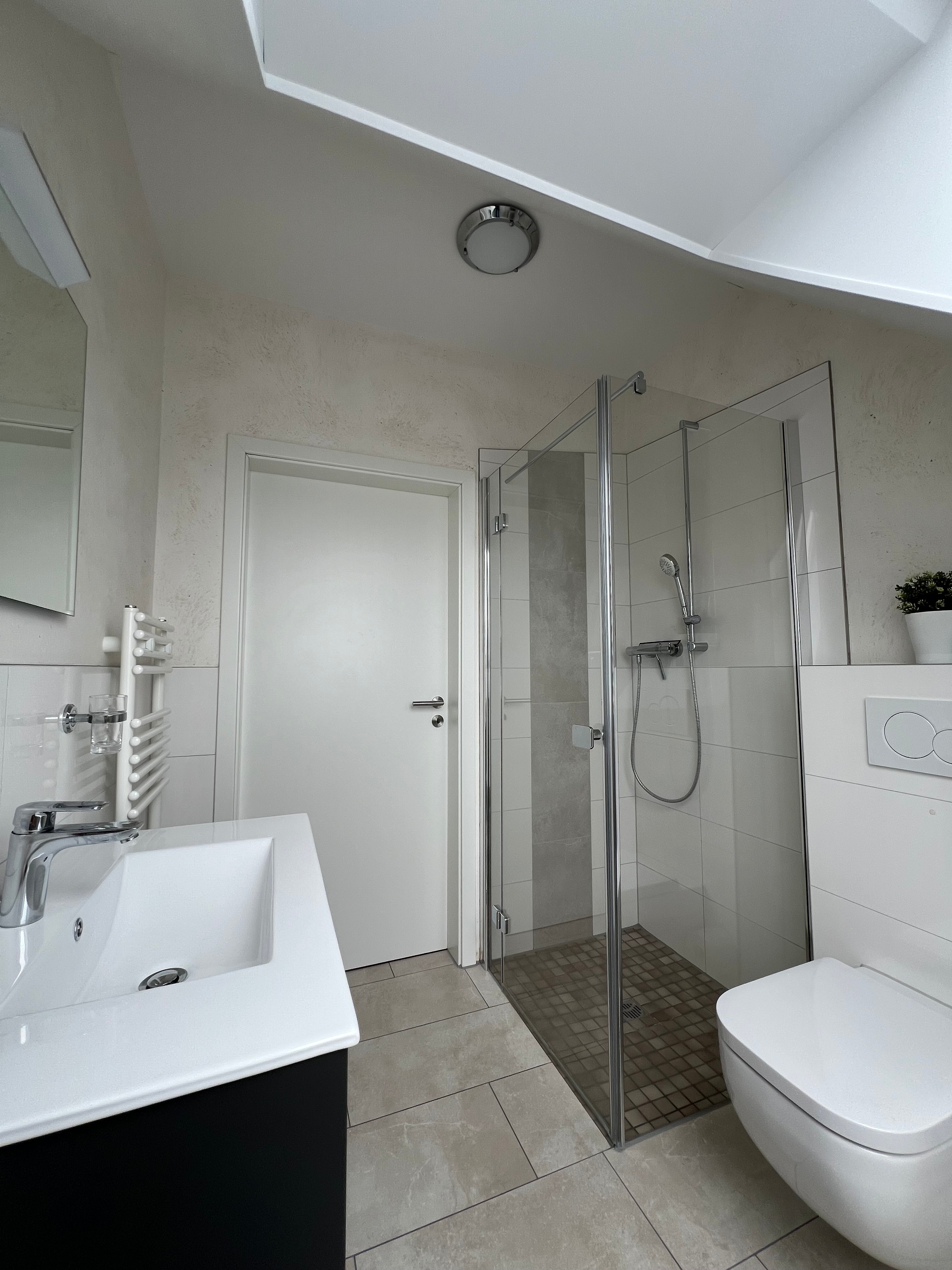 Das moderne Badezimmer verfügt über eine ebenerdigen Dusche, einen beheizbaren Handtuchhalter und einen Föhn.