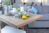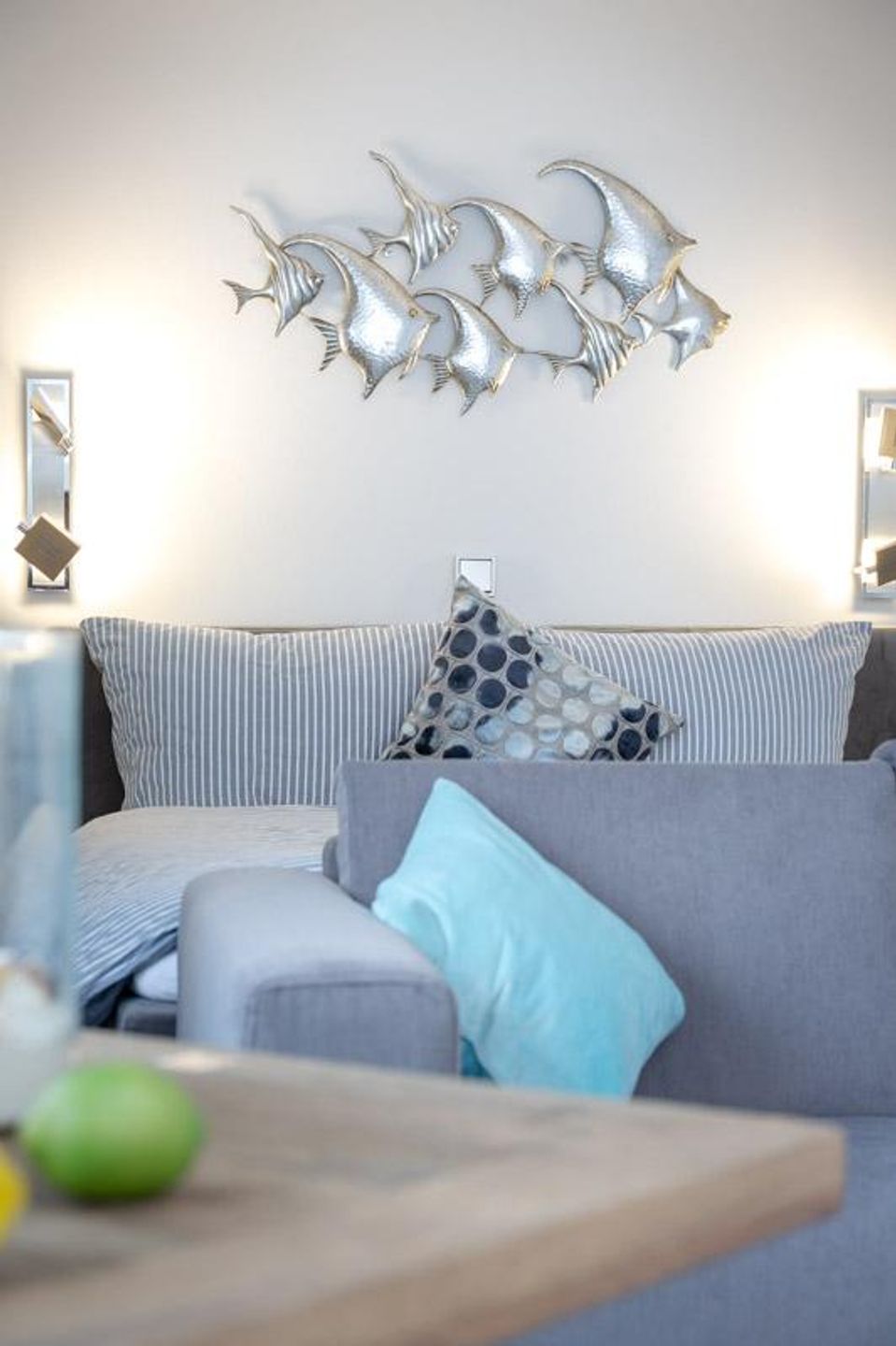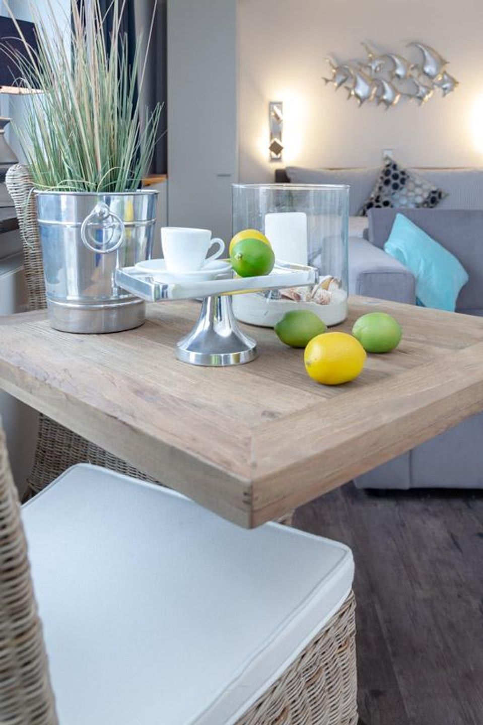 Die Wohnung verfügt über einen offenen Wohnbereich, der durch große Fenster lichtdurchflutet ist. Hier finden Sie einen komfortablen Wohnbereich mit gemütlichem Sofa und einem Essbereich, ideal für gemeinsame Mahlzeiten oder entspannte Abende. Der integrierte Kochbereich ist komplett ausgestattet mit modernen Küchenutensilien, einem Herd, Kühlschrank, Mikrowelle, Espressomaschine und sogar einer Kaffeemaschine – alles da, um sich nach einem aufregenden Tag am Strand zu stärken.