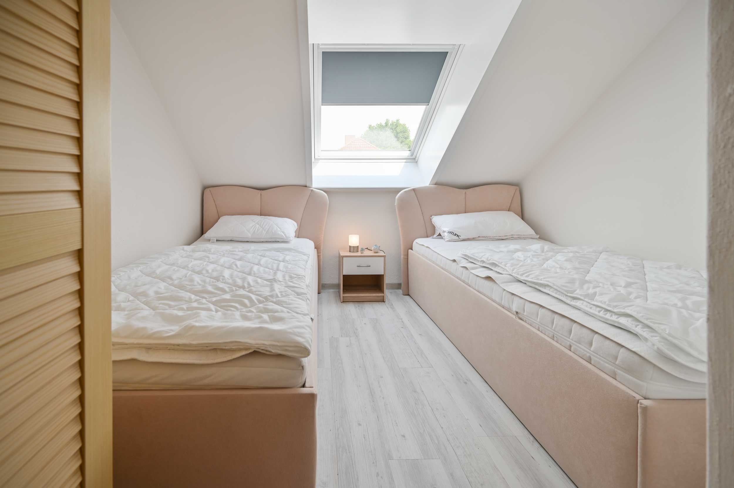 Das große Schlafzimmer besteht aus einem Doppelbett mit zwei Nachttischen und Kleiderschrank, dass zweite Schlafzimmer verfügt über zwei Einzelbetten mit Kleiderschrank. Sollte ein Kleinkind mitreisen, steht ein Kinderreisebett und ein Hochstuhl bereit. Das Badezimmer verfügt über ein Außenfenster zum Lüften und besteht aus einer Dusche mit Glastüren und einem WC.