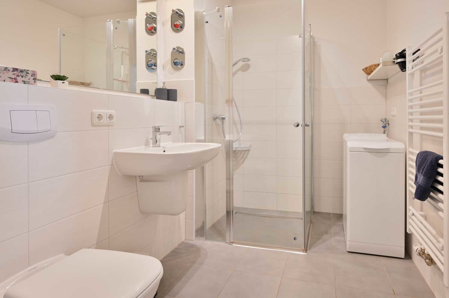 Das innenliegende Bad, mit Handtucherwärmung, Badradio, Bodengleicher Dusche und Waschmaschine ist harmonisch gestaltet.
