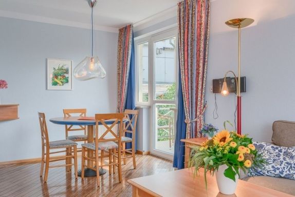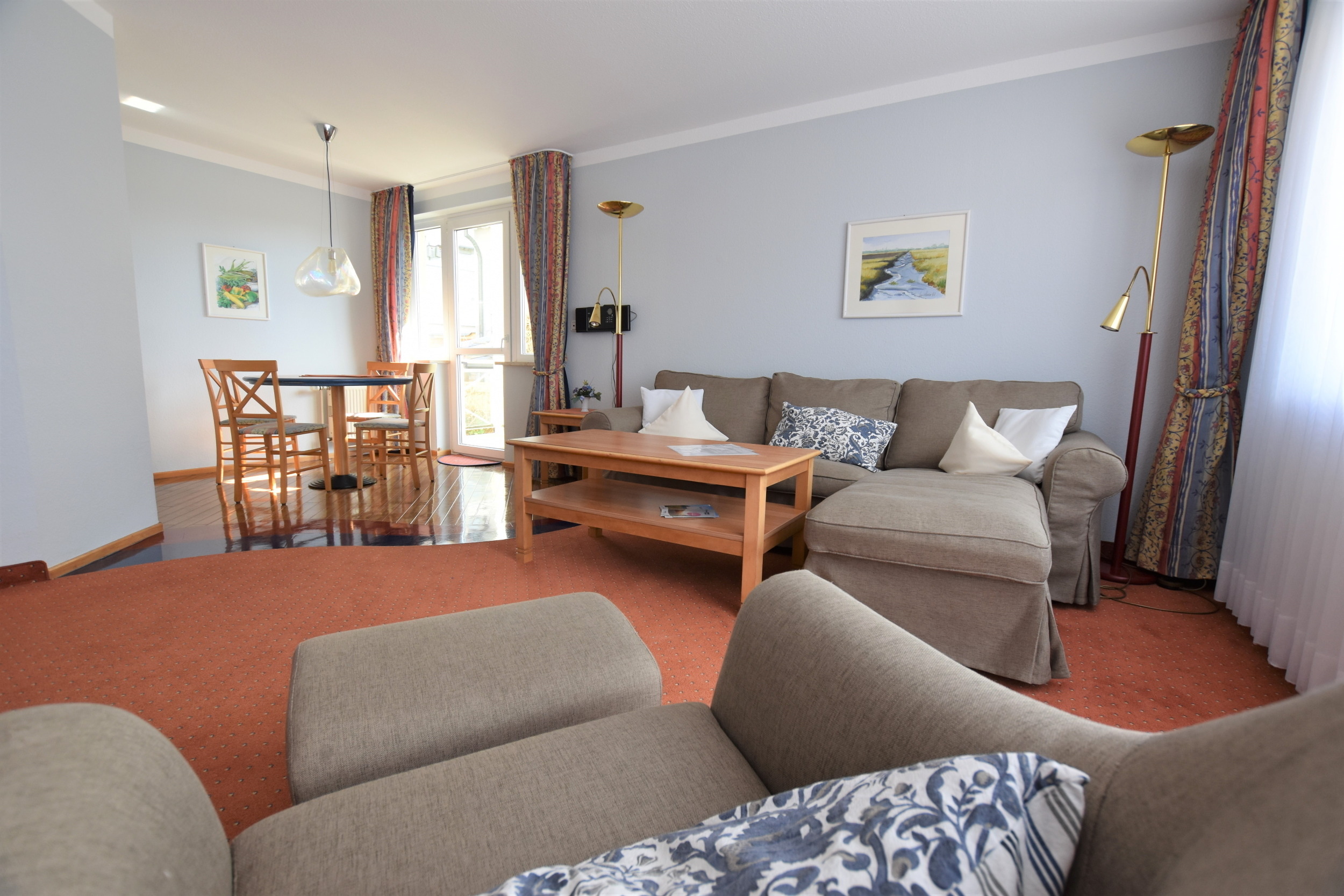 Es erwartet Sie eine drei Zimmerwohnung auf ca.68 m² für max. 4 Erw. + ein Kleinkind. ein großer Eingangsbereich mit Garderobe, ein geschmackvoll eingerichteter Wohnraum mit Sofabereich, Flachbild-TV, Esstisch und direktem Zugang zum bestuhlten Südbalkon. eine separater Küche mit Geschirrspüler, Ceranfeld, Mikrowelle und Waschmaschine. Schlafraum (1) mit Doppelbett (2x90x200), Kleiderschrank, Nachtisch, Nachtischlampe und Flachbild-TV. Schlafraum (2) mit zwei Einzelbetten (90x200), Kleiderschrank, Nachtisch, Nachtischlampe. sowie einem Duschbad mit Dusche, Waschbecken, Spiegelschrank und WC. WLAN steht Ihnen kostenfrei zur Verfügung.