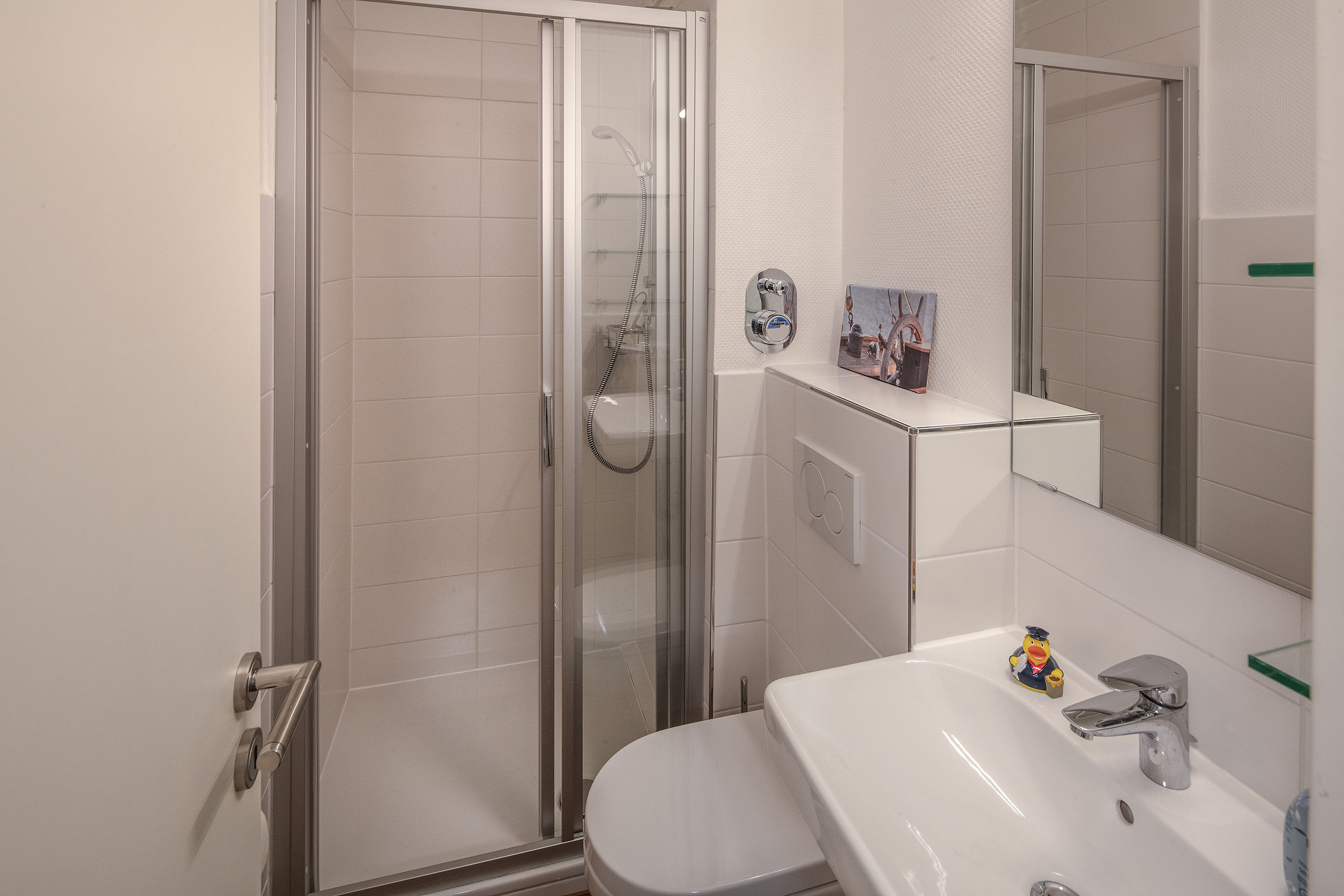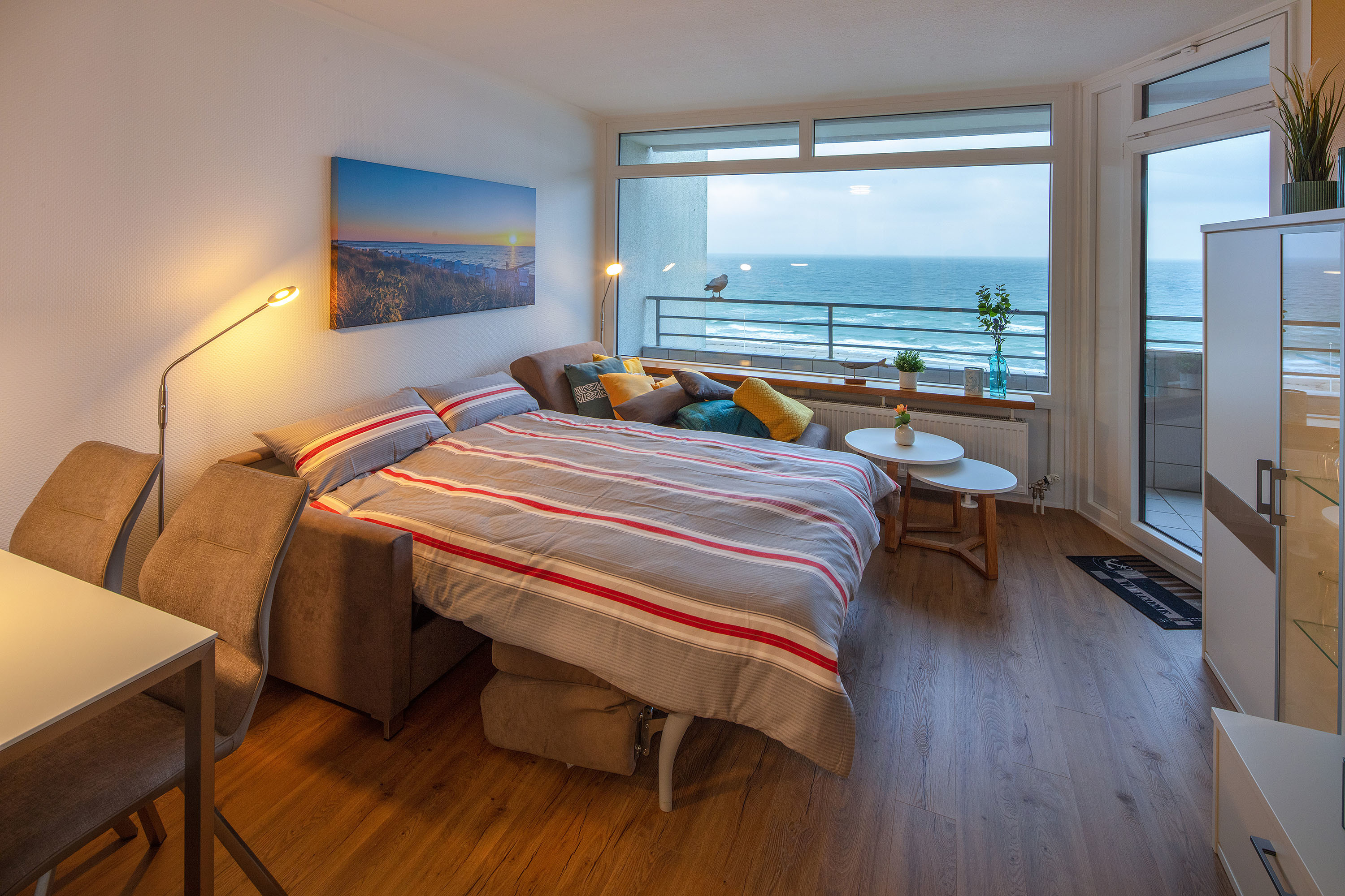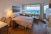 Im Duschbad gibt es eine Handtuchtrockner-Heizung, Regale und einen Föhn. Im Schlafzimmer befinden sich, neben einer Kommode, zwei Einzelbetten, (90 x 190 cm und 90 x 200 cm). Matratzen-Seiten mit unterschiedlichen Härtegraden. Über den Betten gibt es Bücherregale mit Leselampen. Auch aus dem Schlafzimmer haben Sie den tollen Blick auf Strand und Wasser.